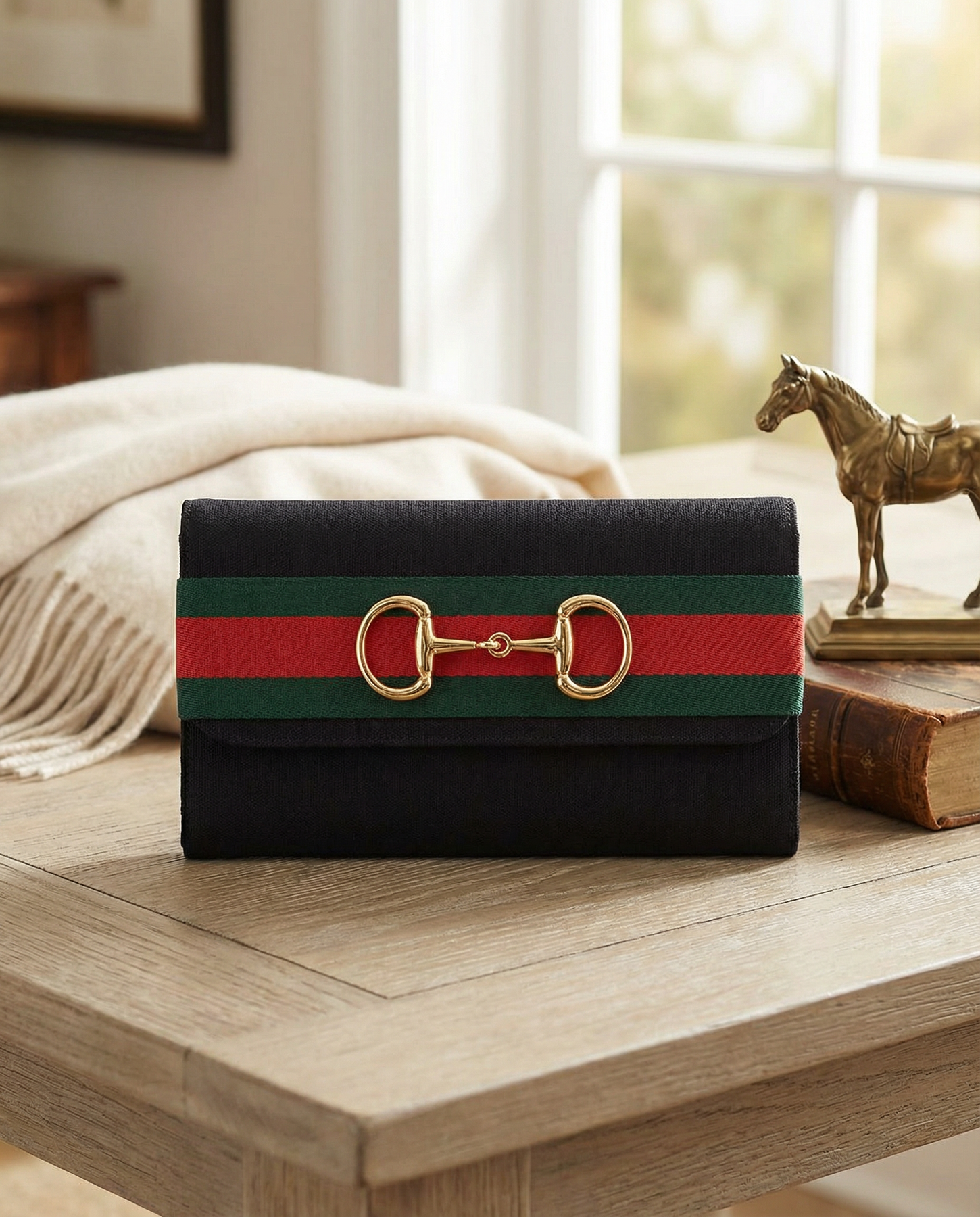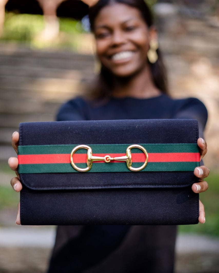 This effortlessly chic clutch is your new go-to from morning errands to evening events. Made from classic black canvas with bold green and red ribbon detail, it features a gold-tone horse snaffle accent for a sophisticated equestrian-inspired touch. Wear it as a crossbody with the included chain or carry it solo! Either way, it’s a standout.