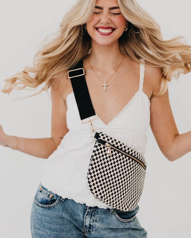 Elevate your everyday style with the Westlyn Woven Bum Bag in Checkered Black, a bold blend of function and fashion. This stylish crossbody features intricately woven vegan leather and a standout block design strap for a modern, edgy touch.