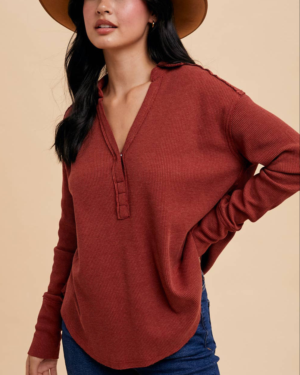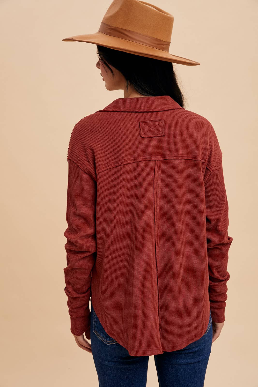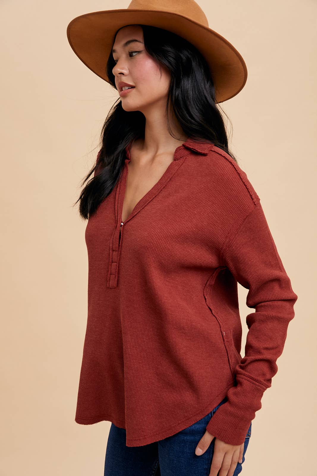 Fall in love with the cozy texture and relaxed style of the Simone Thermal Polo in rich burgundy. The garment-washed thermal fabric adds that perfect vintage feel while the collared V-neck keeps it looking effortlessly chic.