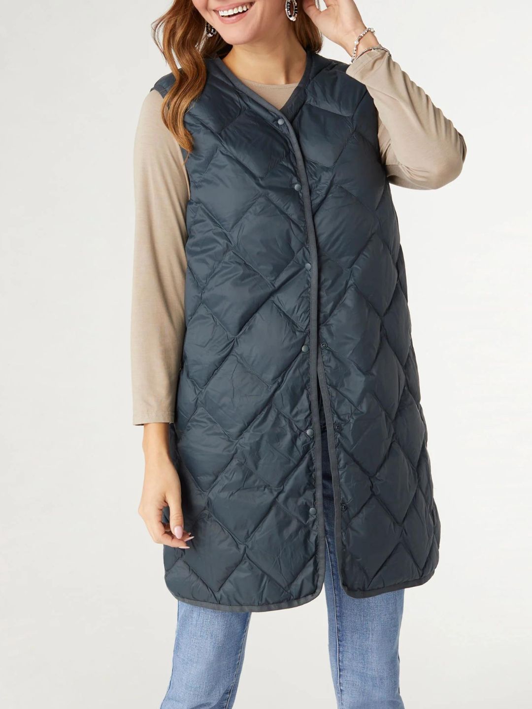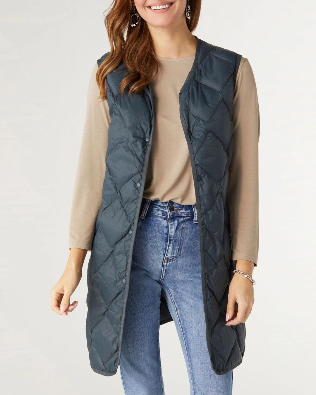 Stay warm and stylish on the go with our Sabra Packable Lightweight Down Vest in dark teal. Filled with real duck down, this vest offers exceptional warmth without the bulk, making it the perfect layering piece for your adventures. The long body, curved hem, and diamond quilting give it a flattering fit, while the button-snap closure and side pockets add both functionality and style.