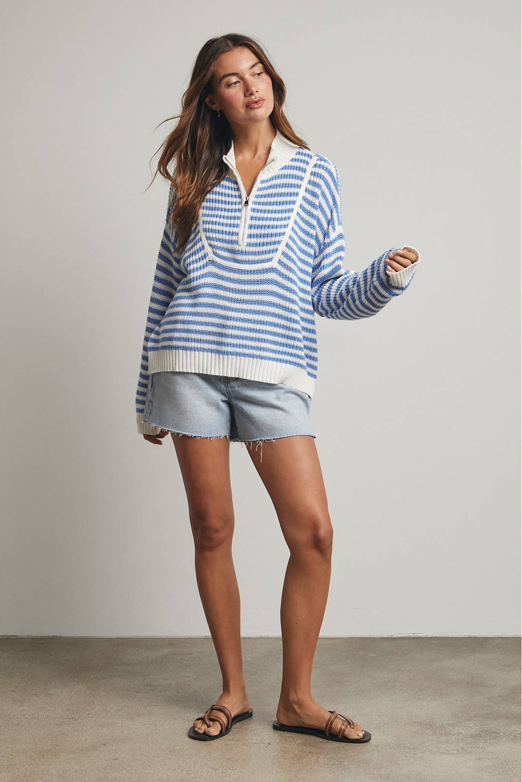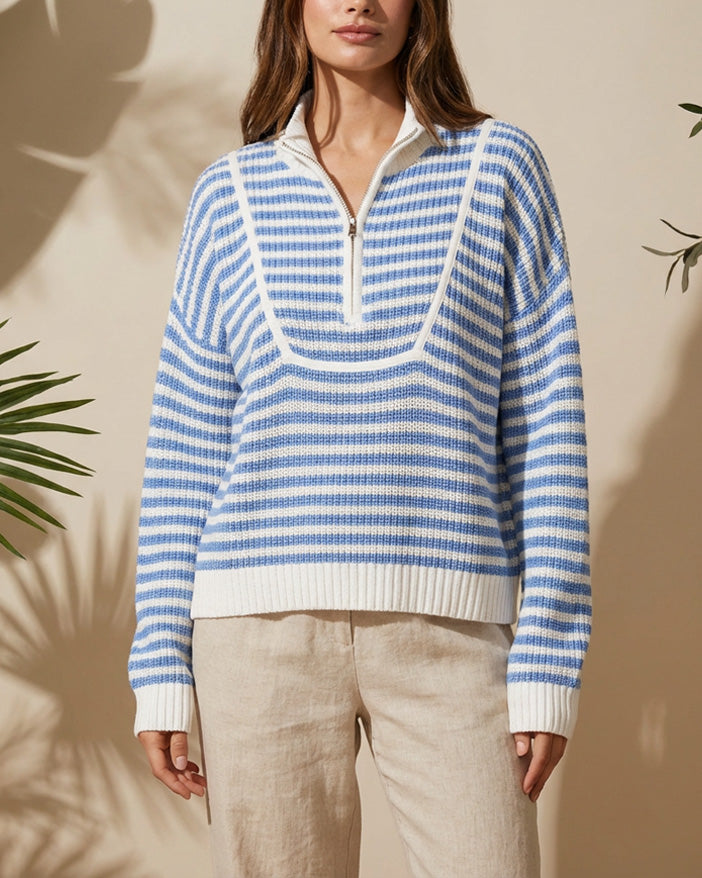 The Sophia Striped Half-Zip Sweater in blue delivers the same sporty-chic comfort with a fresh, classic color palette. Soft fabric, a relaxed silhouette, and an adjustable zip neckline make this an easy go-to for casual days, travel, or light layering.