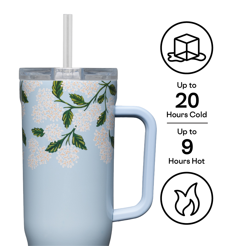Stay stylishly hydrated on every adventure with the Gloss Blue Hydrangea 40oz Cruiser Tumbler from the Rifle Paper Co. x Corkcicle collection. Featuring Rifle Paper Co.’s signature floral design, this oversized tumbler keeps drinks cold for up to 20 hours or hot for up to 9. With its triple-insulated stainless steel construction, dual-function sip + straw lid, and comfy soft-grip handle, it’s the perfect companion for road trips, errands, workouts, or relaxing days at home.