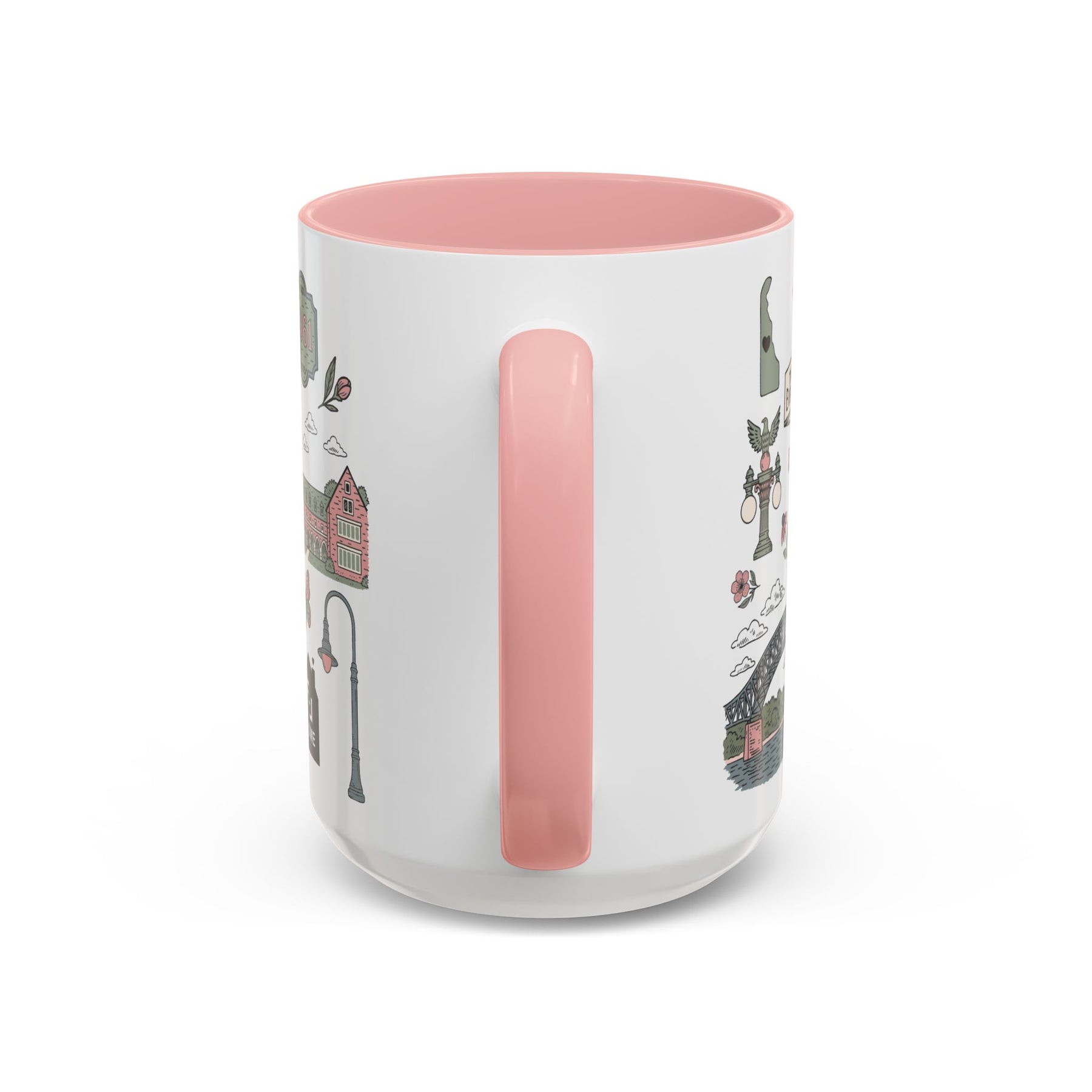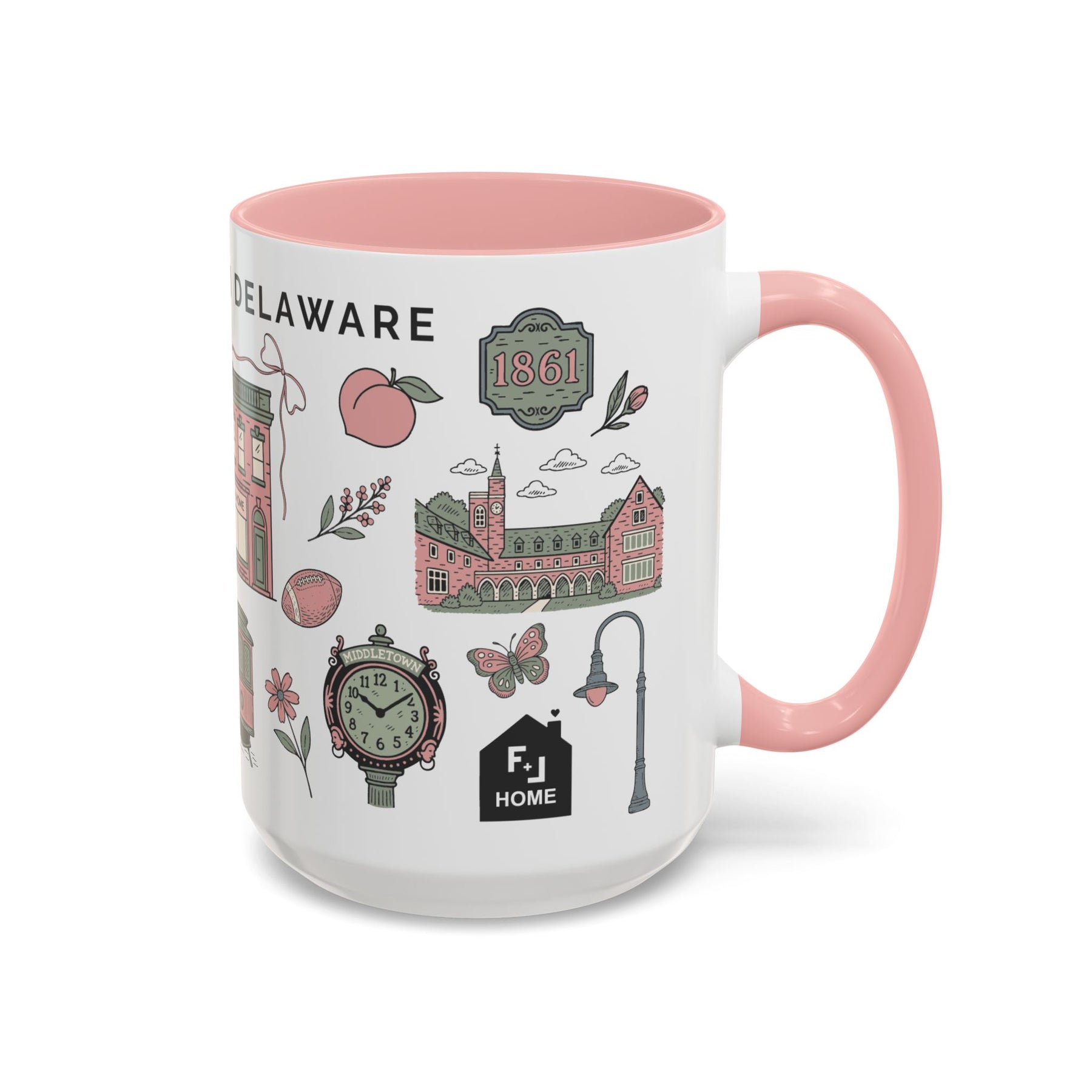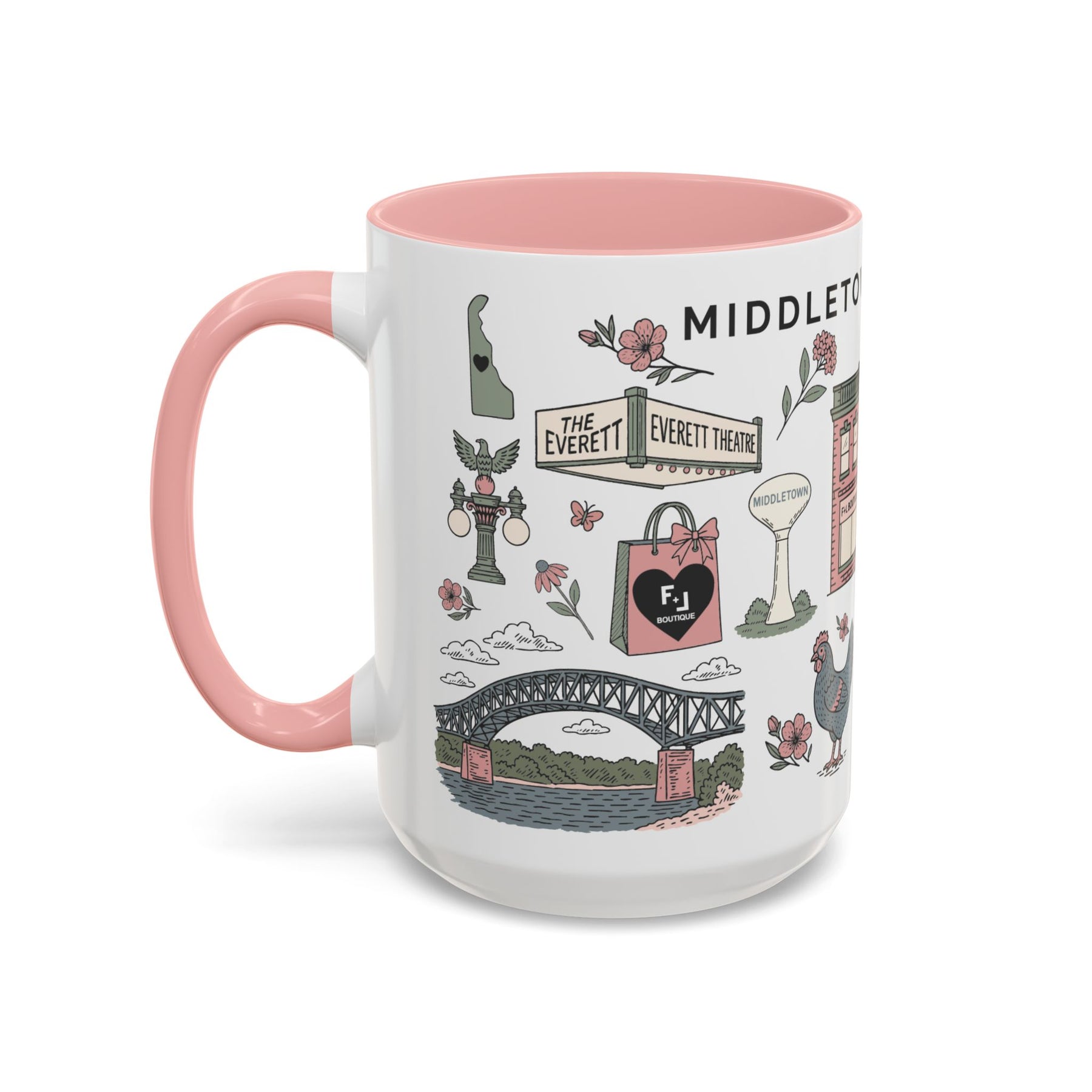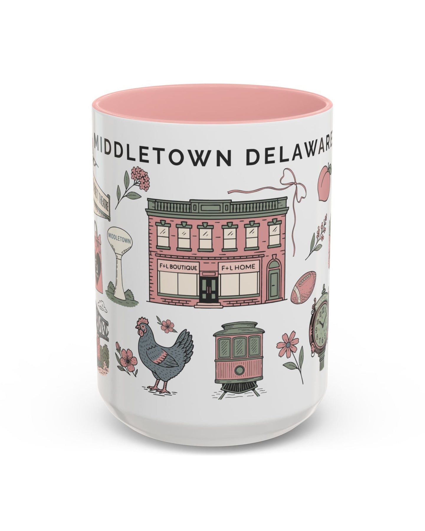 Celebrate your favorite hometown haunts with our charming Middletown, Delaware ceramic mug, featuring original illustrations inspired by local icons. From the historic Everett Theatre and iconic water tower to the Summit Bridge, vintage trolley, F+L Boutique, and F+L Home storefronts... each detail was lovingly created to honor the heart and charm of our town. Blush-toned flowers, a coquette-style bow, and other whimsical accents wrap the design in playful nostalgia, making this the perfect keepsake or gift for anyone who holds Middletown close.