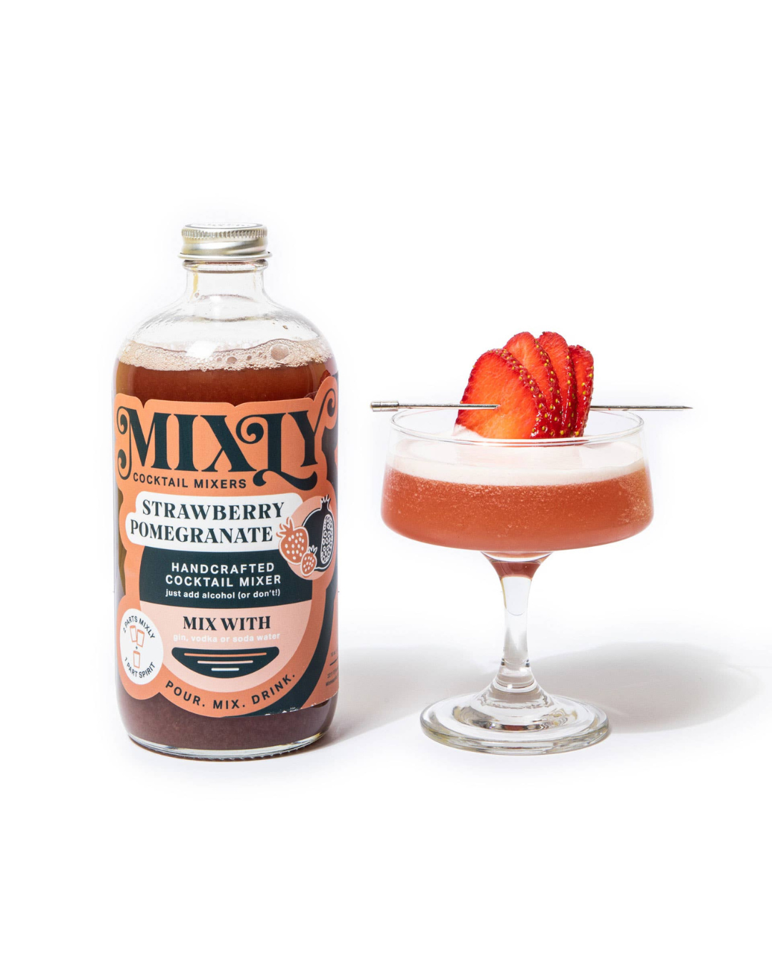 Indulge in the bold, juicy flavors of Mixly Strawberry Pomegranate Cocktail Mixer, a handcrafted blend of ripe strawberries, tangy pomegranate, zesty lemon, and honey for the perfect balance of sweet and tart. Whether crafting a cocktail or a zero-proof drink, this vibrant mixer transforms any occasion into a special celebration.