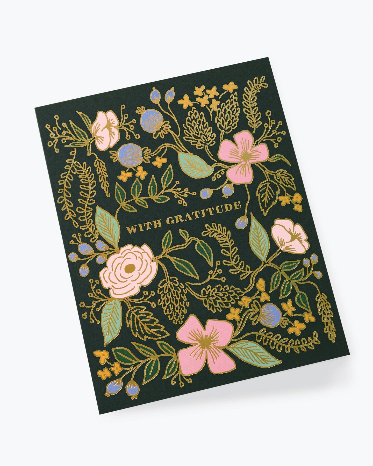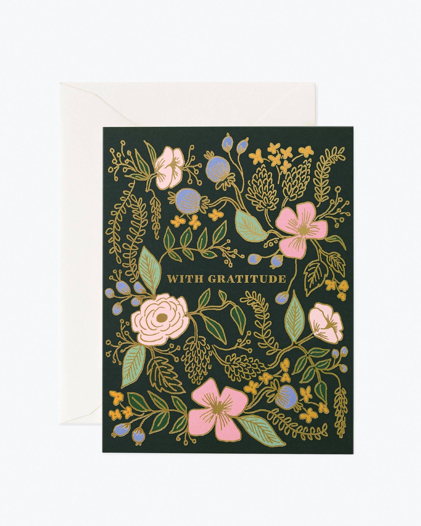 Express your heartfelt thanks with this elegant floral card, adorned with shimmering gold foil accents. Whether you're showing appreciation for a kind gesture, a gift, or simply someone's presence in your life, this beautifully designed card offers a timeless way to say "thank you." A blank interior lets your handwritten message shine.