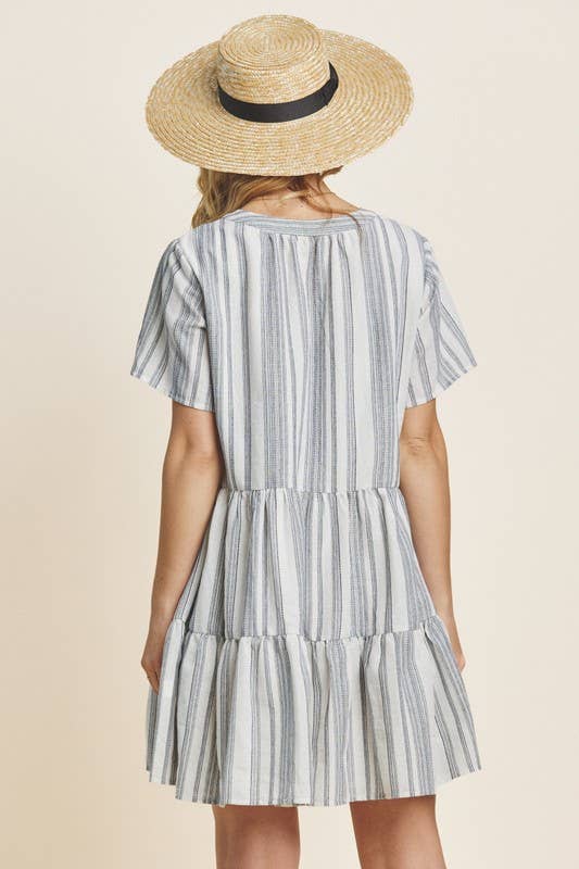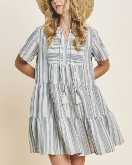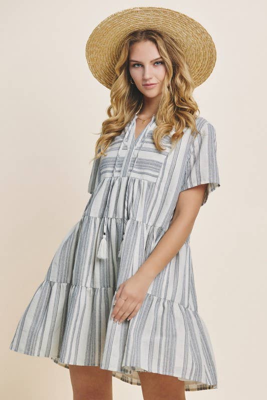 Classic meets playful in the Gabriella Mini Dress. Featuring a navy and white yarn-dye stripe print, this tiered silhouette includes a split neckline with a tie closure and short sleeves for a breezy, flattering fit. Lightweight and lined for comfort, it's a go-to for casual days, brunches, and summer events.