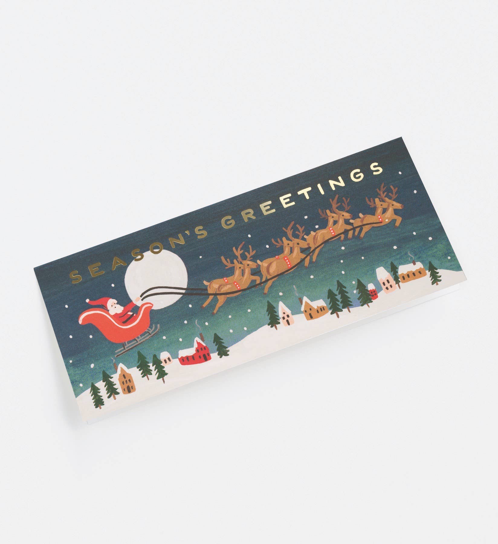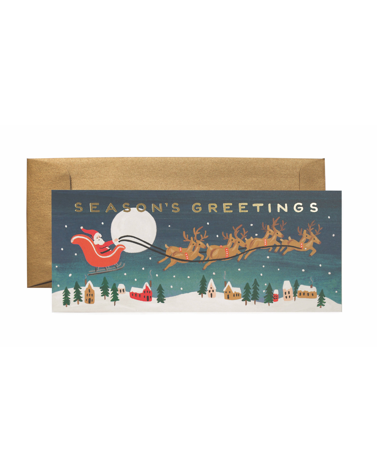 A festive twist on tradition—these extra-long cards are perfect for tucking in holiday cash or checks. Featuring a charming sleigh design and shimmering gold foil accents, each card offers a blank interior for your handwritten message. Packaged with coordinating metallic envelopes for an elevated seasonal send-off.