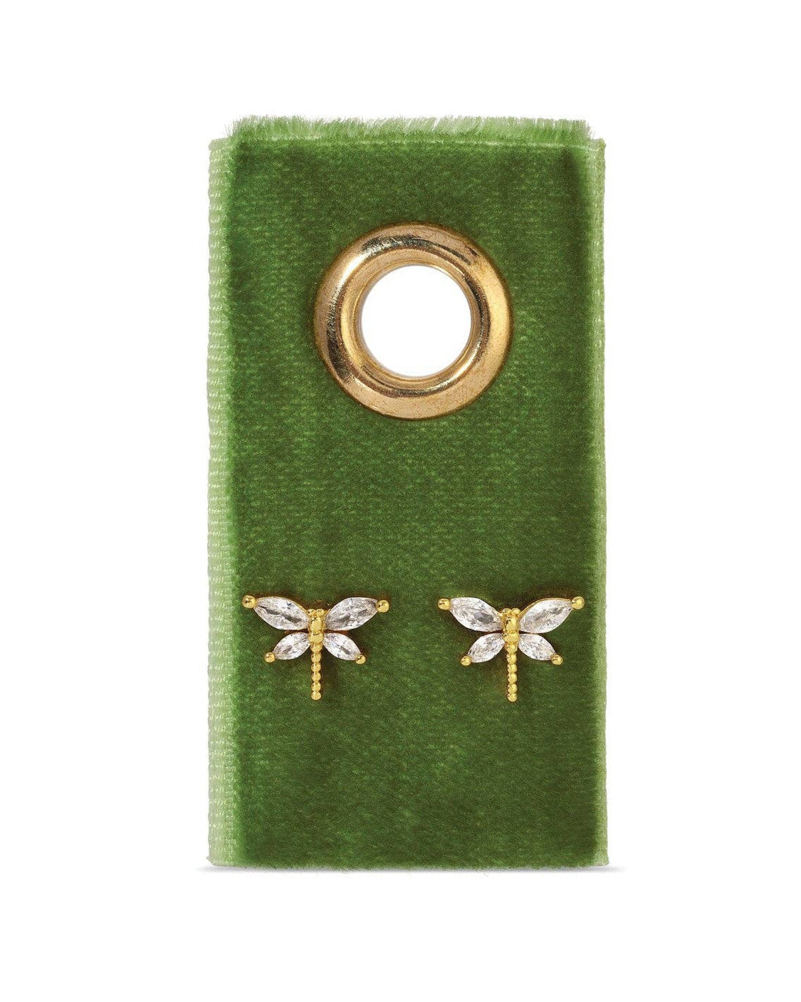Spread your wings and add a touch of whimsy to your look with our Dragonfly Studs on Velvet Gift Tag in Gold. Made with high-quality 18K gold plated brass and sparkling cubic zirconia wings, these 1.25" x 1.9" studs are perfect for any occasion. Don't be afraid to take flight (or show off your funky side) with these unique and elegant earrings.