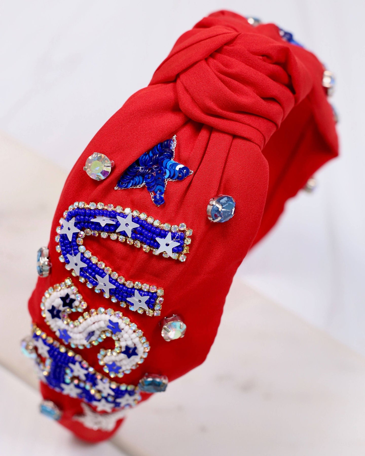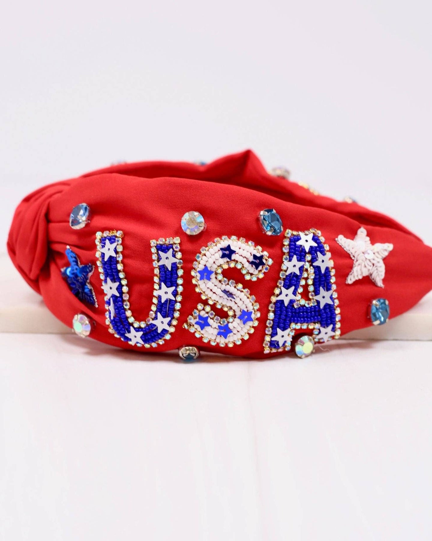 Get ready to celebrate the USA with this patriotic fabric headband! It is embellished with beading, sequins, and accent rhinestones.