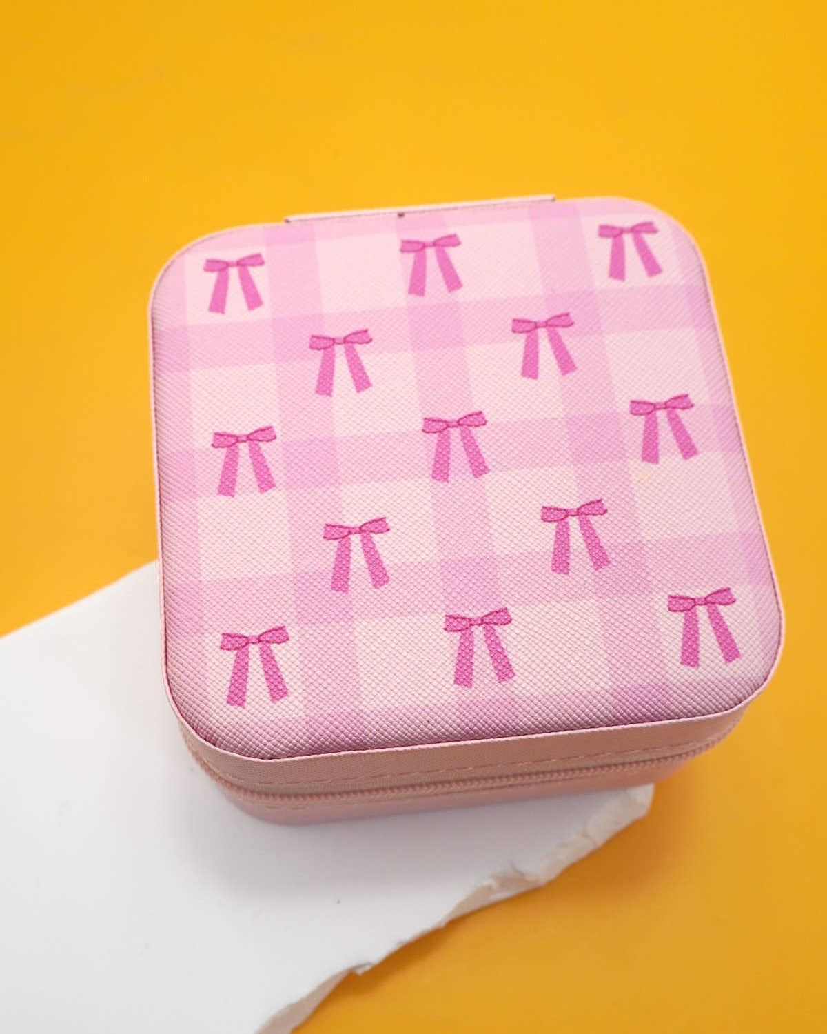 Playful and polished, this pink plaid travel jewelry box features a charming bow detail and thoughtfully designed interior. Compact yet spacious, it keeps jewelry neatly stored and protected wherever you go.