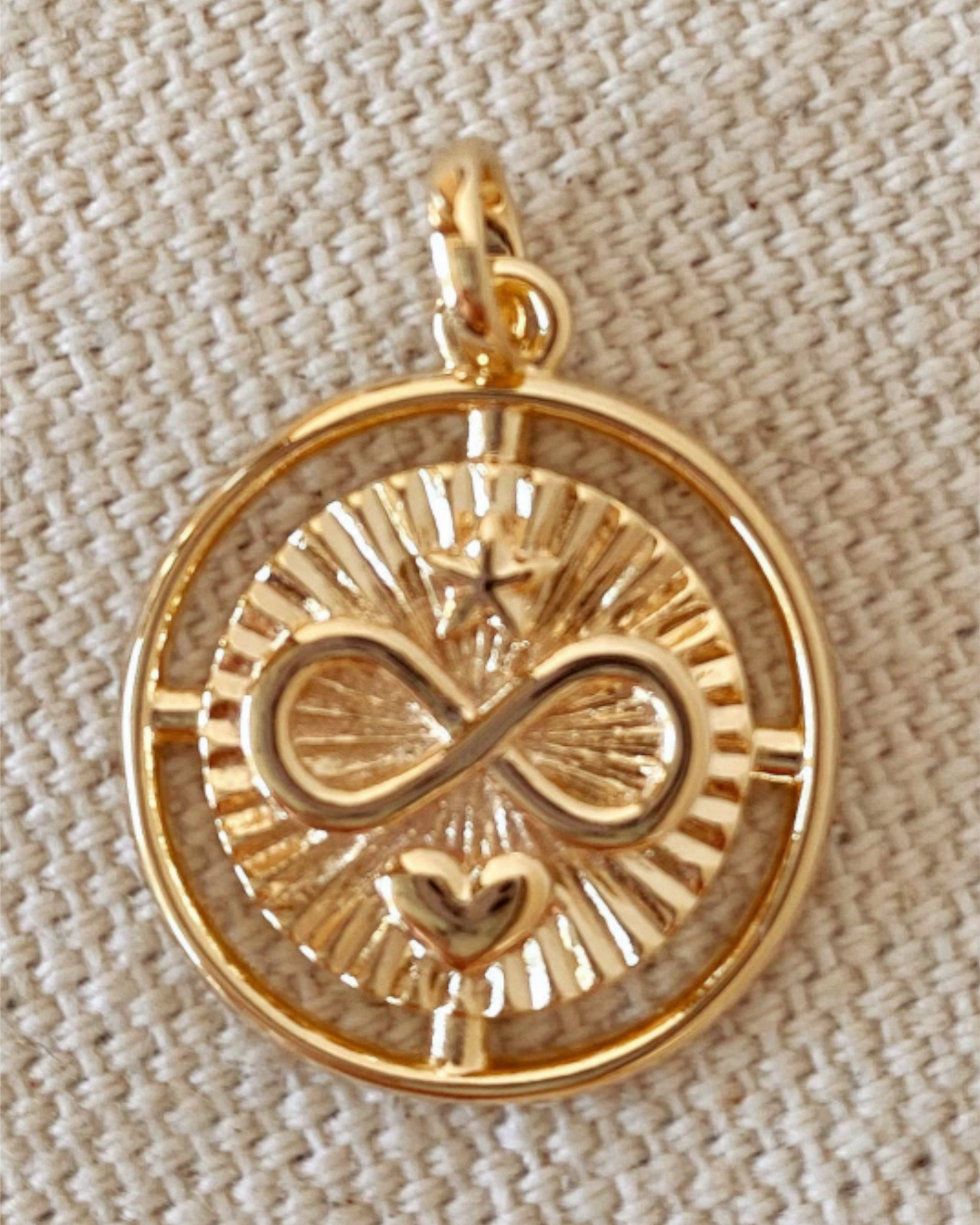 Fine casting made Infinity Love inspired pendant in 18k gold filled. A great design featuring spokes from center to the edges of the medal, followed by a gold circle. Size: 0.9 inches length and 0.68" diameter An infinity symbol implies that something will last forever, whatever it may be. Many people put infinity symbols on their wedding bands to signify their love will never end.