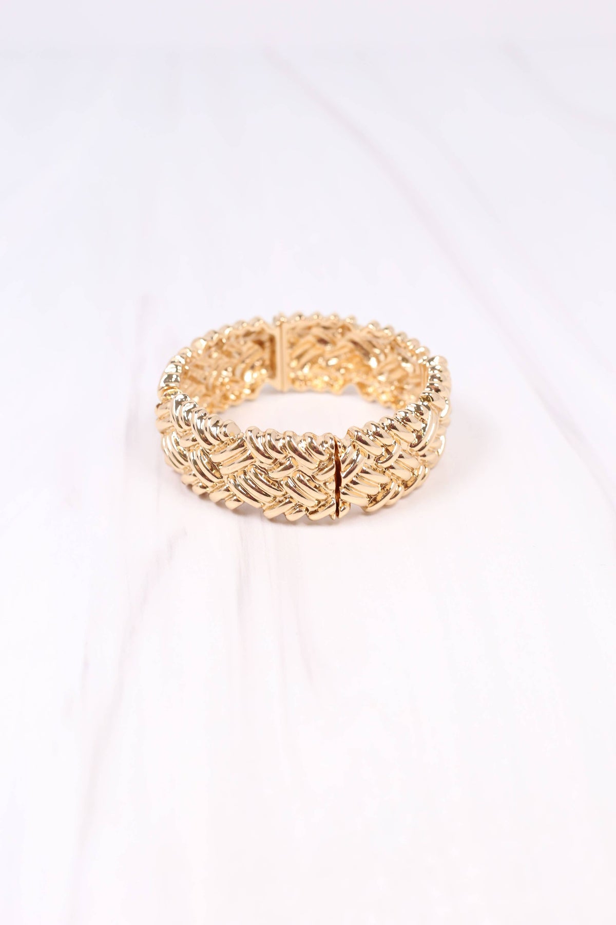 This metal bracelet has a dimensional textured design and stretches to fit most wrists. It perfectly pairs with any look!