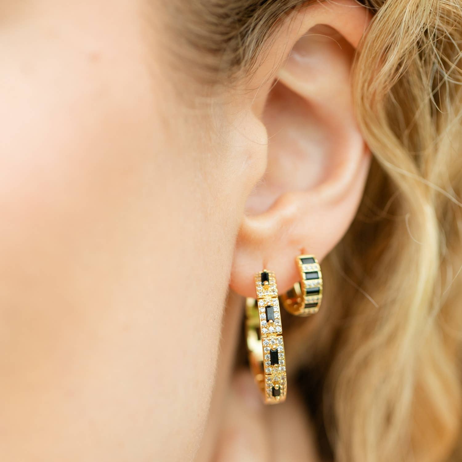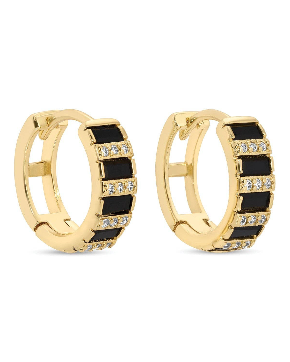 Bold and elegant, these black CZ huggies are a standout twist on a timeless favorite. With a mix of baguette and pavé stones, they bring edge and sparkle to your everyday style.