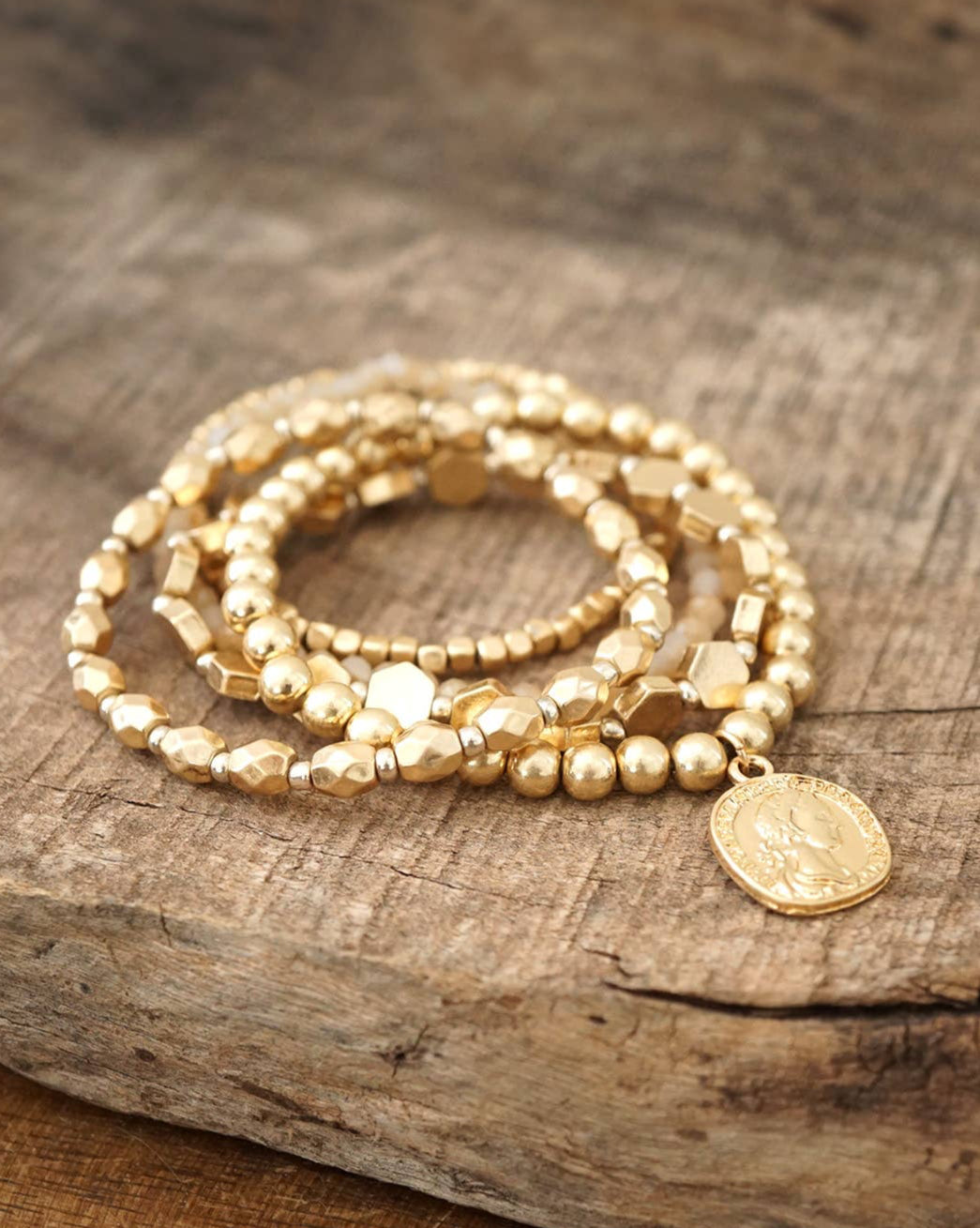 This effortlessly cool stack adds a touch of vintage-inspired charm to any outfit. Featuring a mix of worn gold-tone metal and natural glass beads, each bracelet brings its own texture and shine. The gold coin charm adds the perfect boho finishing touch.