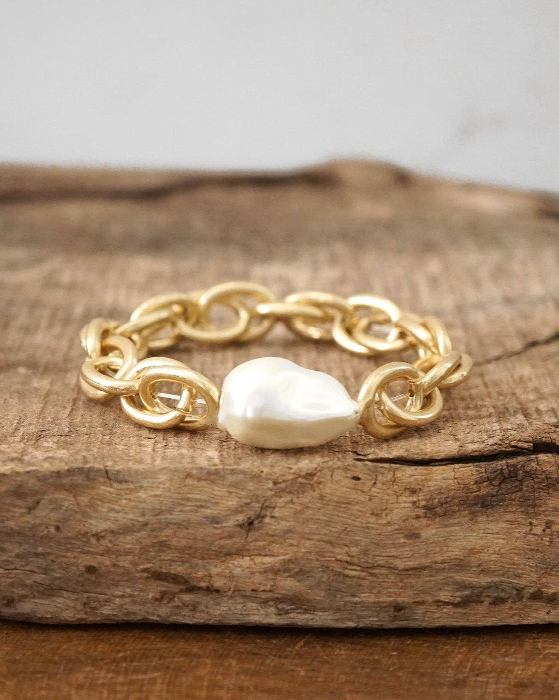 Bold meets refined in this statement-making bracelet. Featuring oversized worn gold chain links and a single lustrous pearl bead, this stretchy bracelet combines edge and elegance with effortless ease. Perfect solo or stacked for impact.