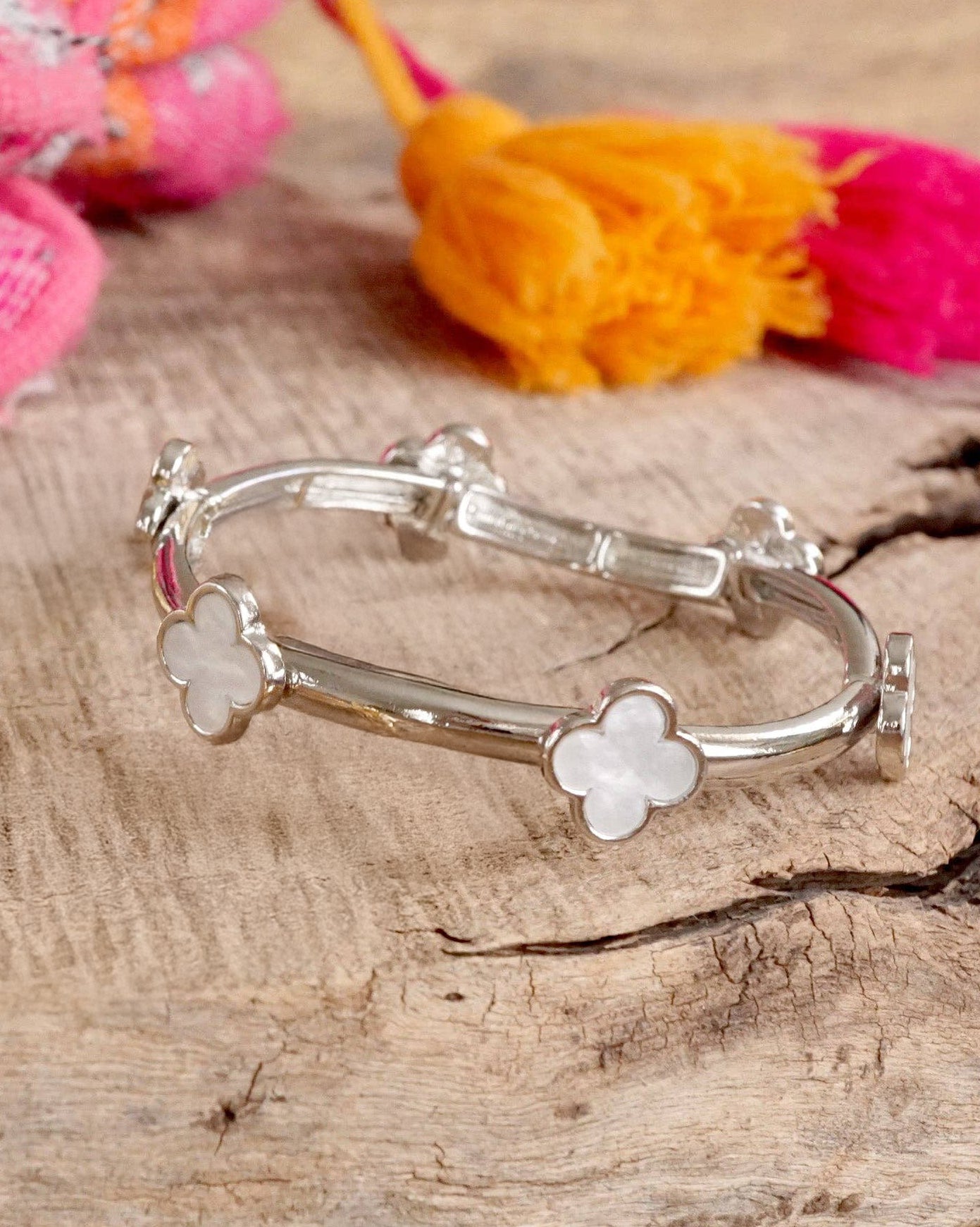 Elegant yet effortless, this silver-tone stretch bangle is dotted with mother-of-pearl clovers that shimmer with natural beauty. The hammered metal finish adds depth and texture to this timeless piece.