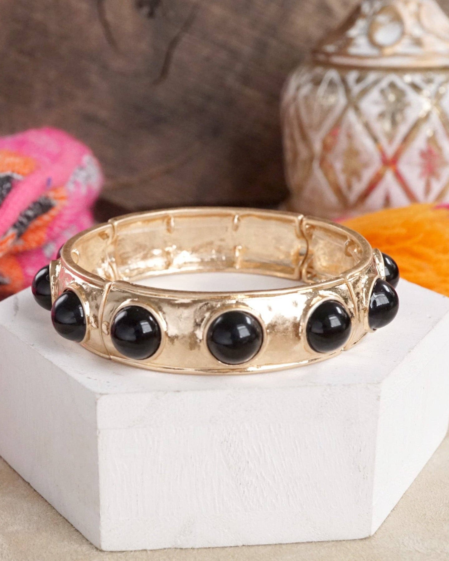 This sleek bangle brings timeless glam with a twist. Its textured gold-tone surface is elevated with glossy black faux cabochons that lend just the right amount of edge. Designed for comfort and style, it easily slips on and pairs effortlessly with both bold and neutral palettes.