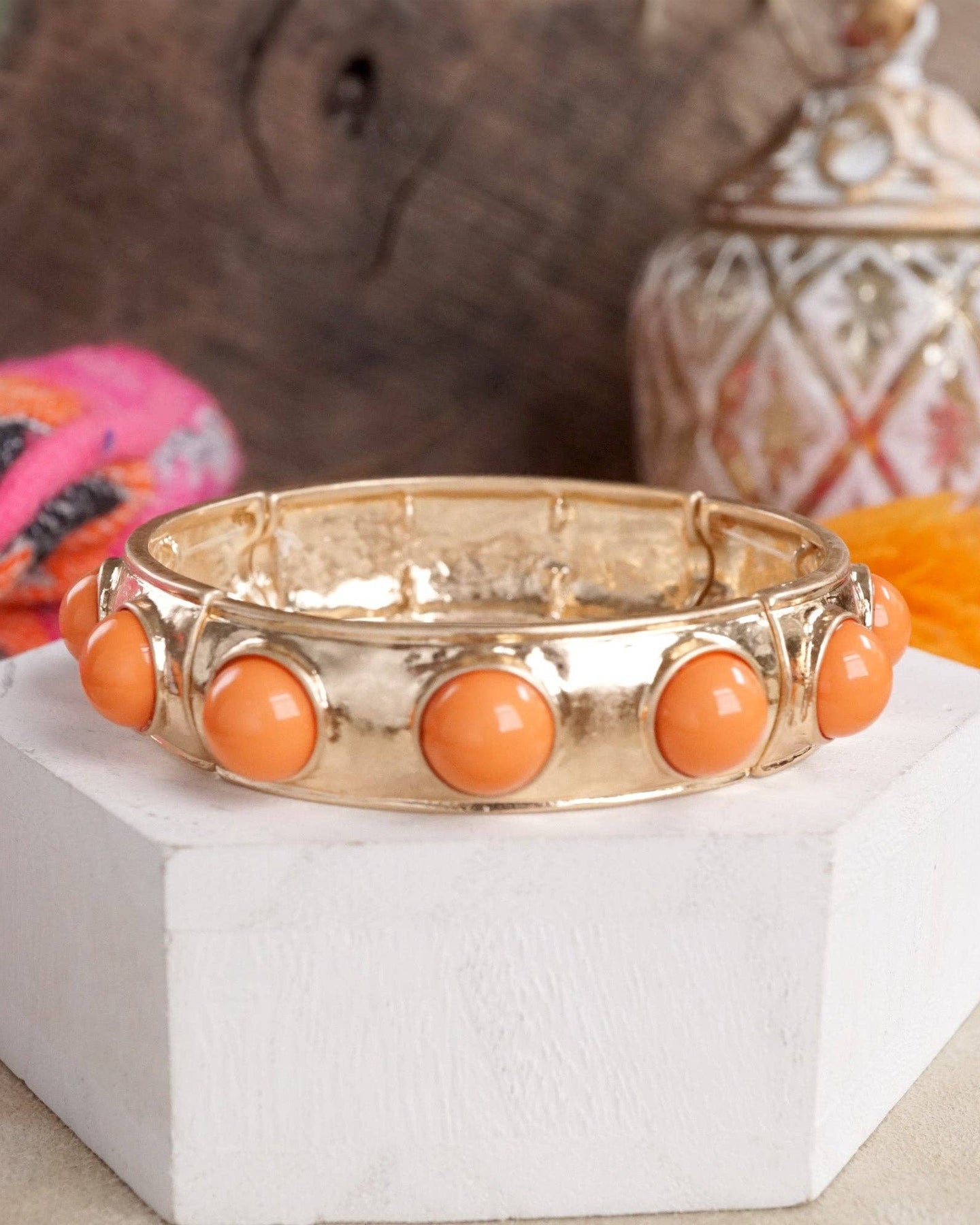 Bold, playful, and perfectly on-trend—this bangle delivers instant impact. Featuring a textured gold-tone finish and rich orange faux cabochons, the stretchy fit adds comfort while the design brings elevated style. It’s the kind of piece that dresses up denim or complements a cocktail look with ease.