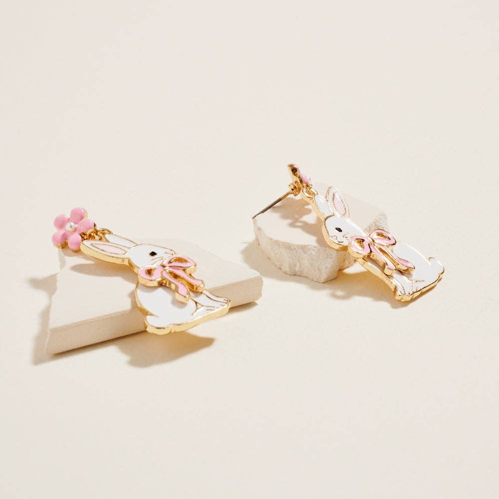 Sweet and storybook-inspired, these bunny earrings feature a floral enamel design finished with a petite bow and gentle movement. Suspended from a delicate flower post accented with a tiny pearl, they bring playful charm and soft elegance to springtime looks.