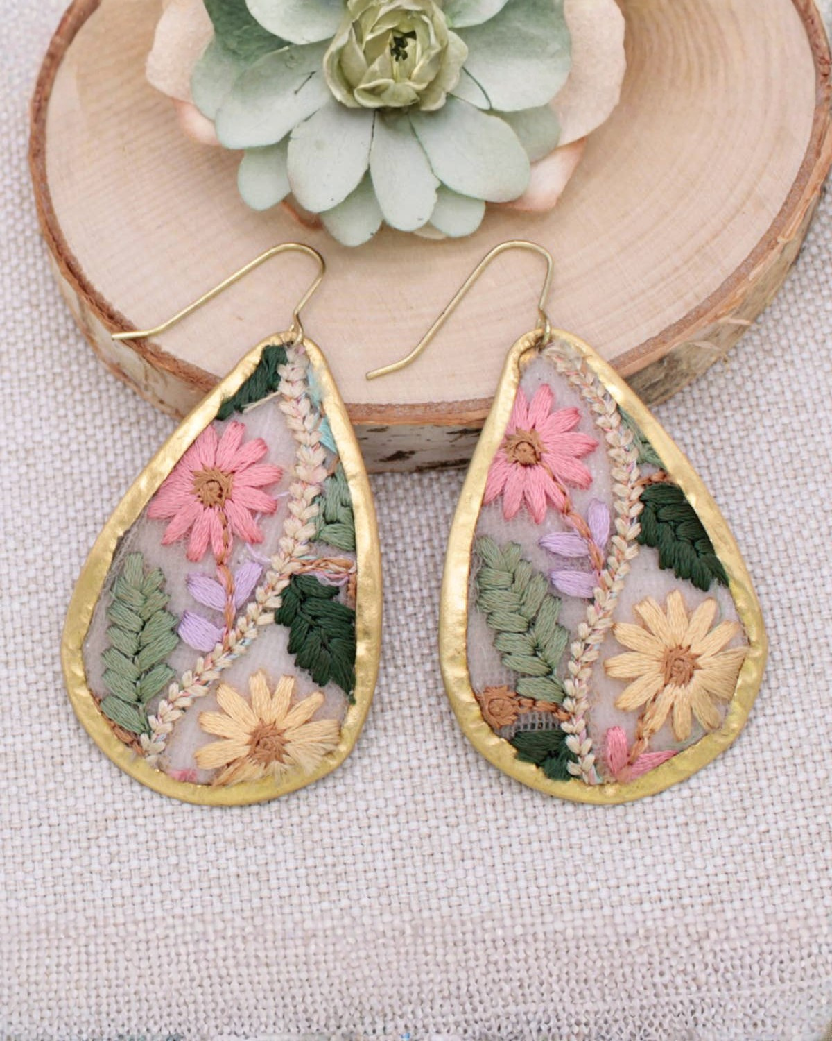Vintage embroidered fabric teardrop earrings