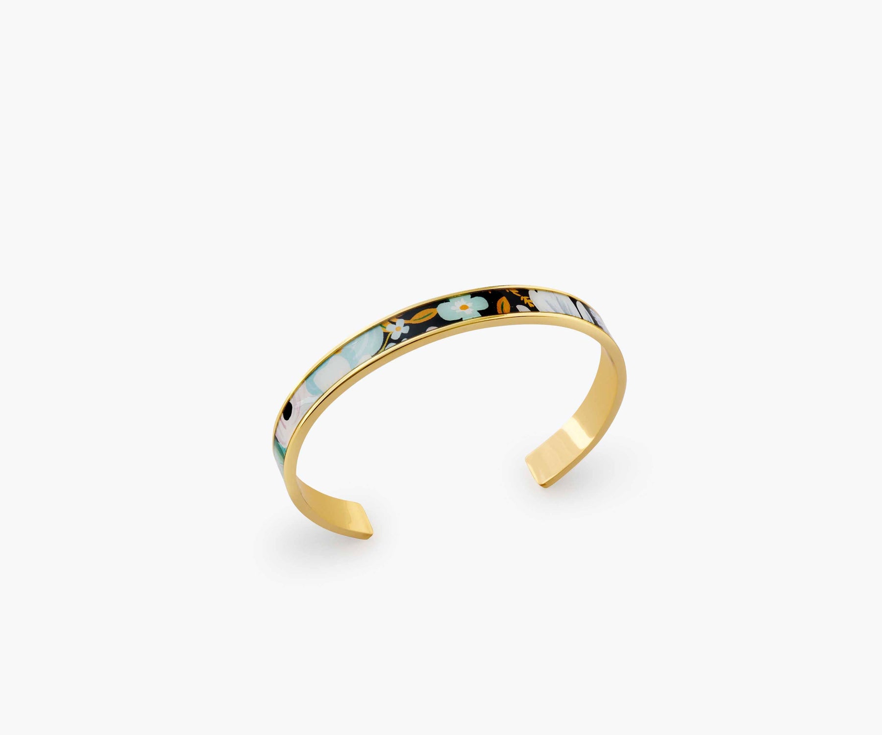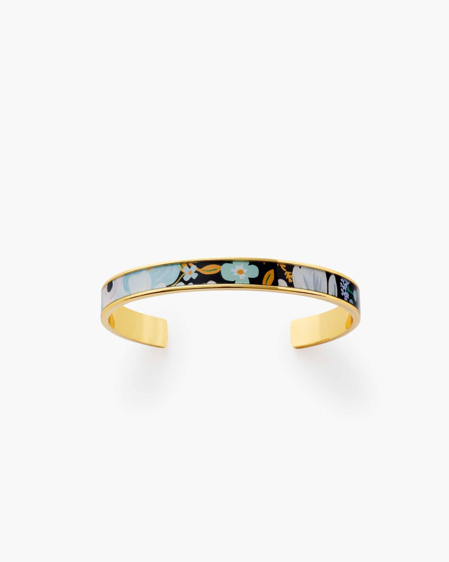 Add a touch of floral charm to your jewelry collection with the Garden Party Blue Enamel Cuff. Designed for versatility, this bracelet can be worn alone or stacked for a bold statement. Crafted with polished enamel and brass gold plating, it features an intricate floral print and a debossed logo on the interior for a refined touch.
