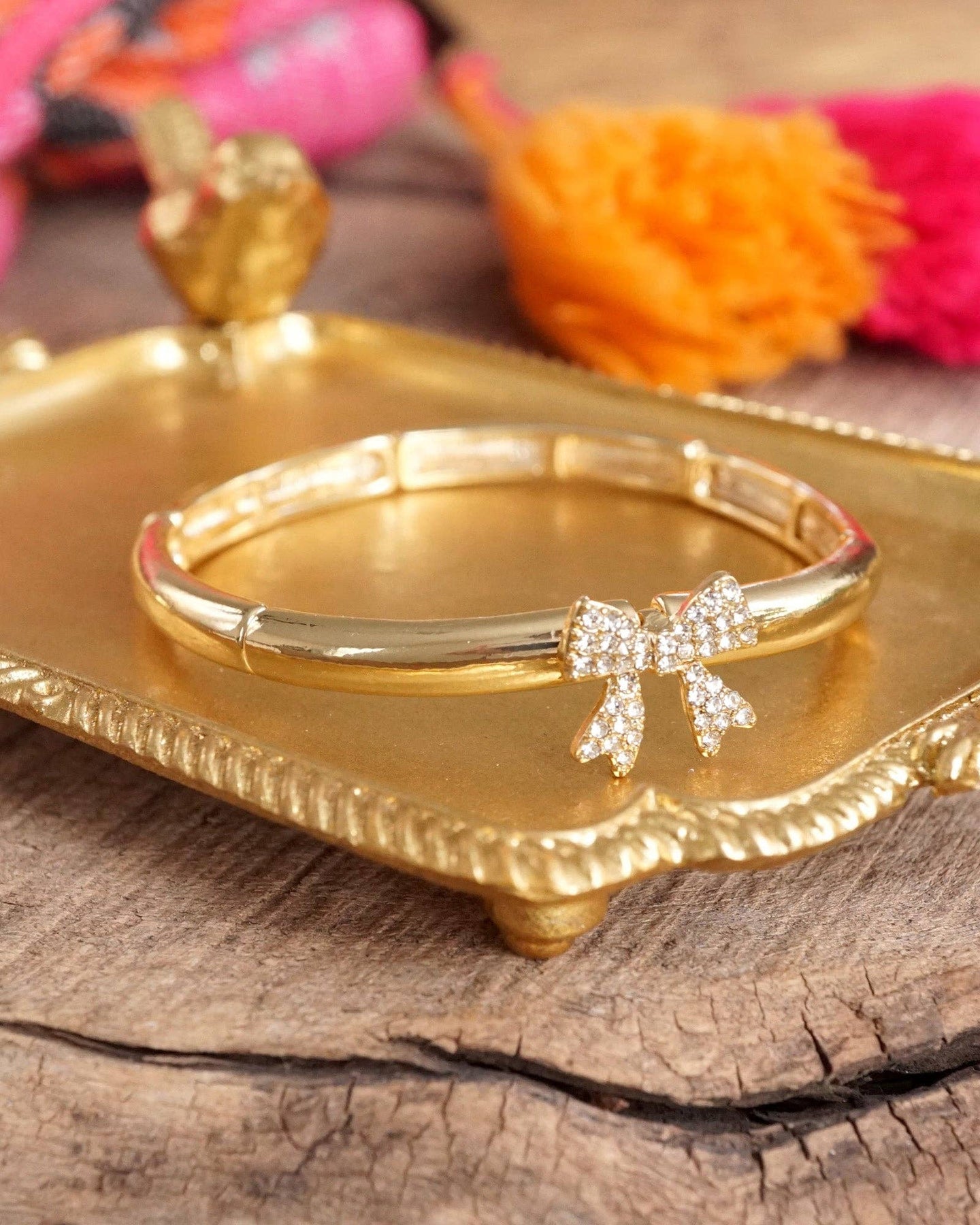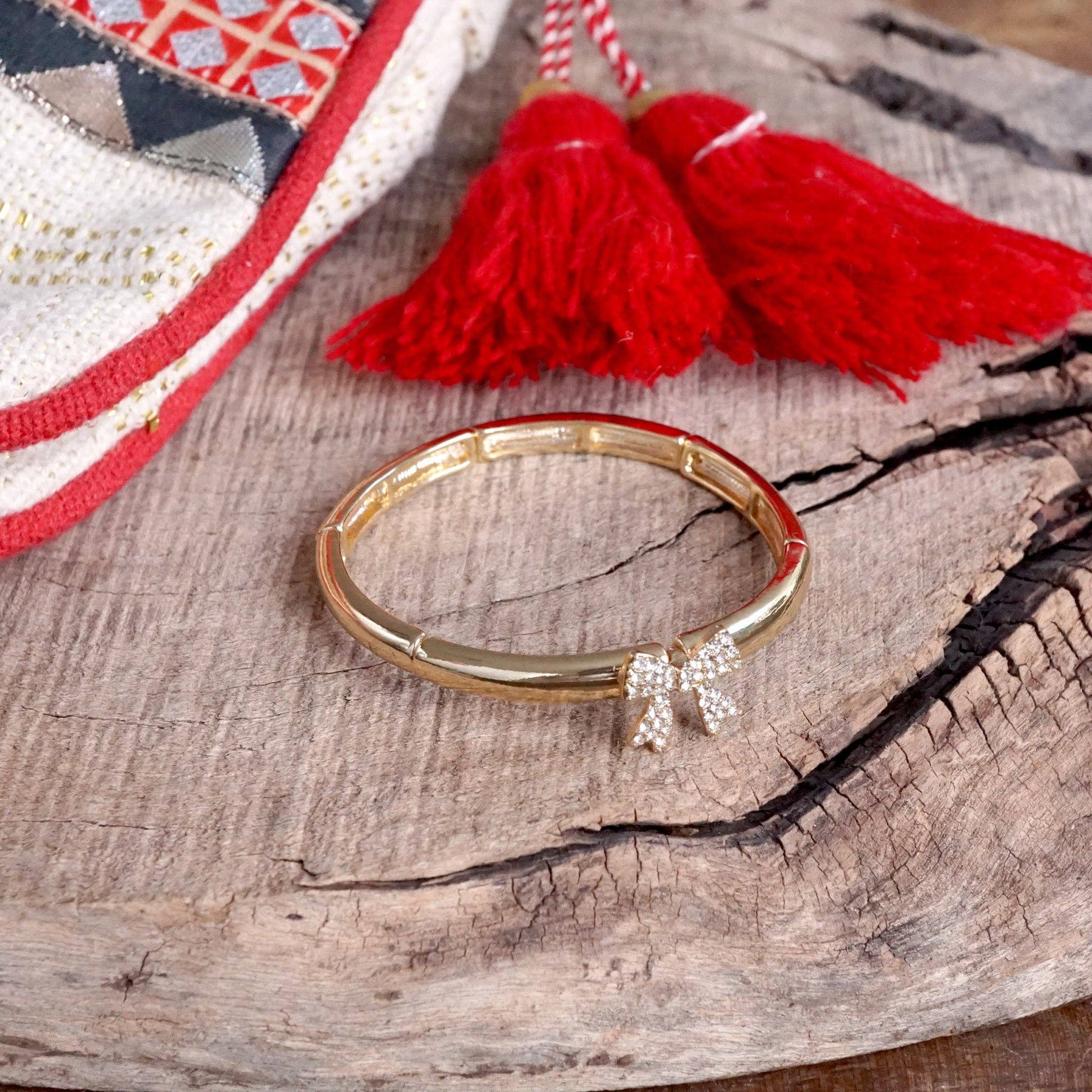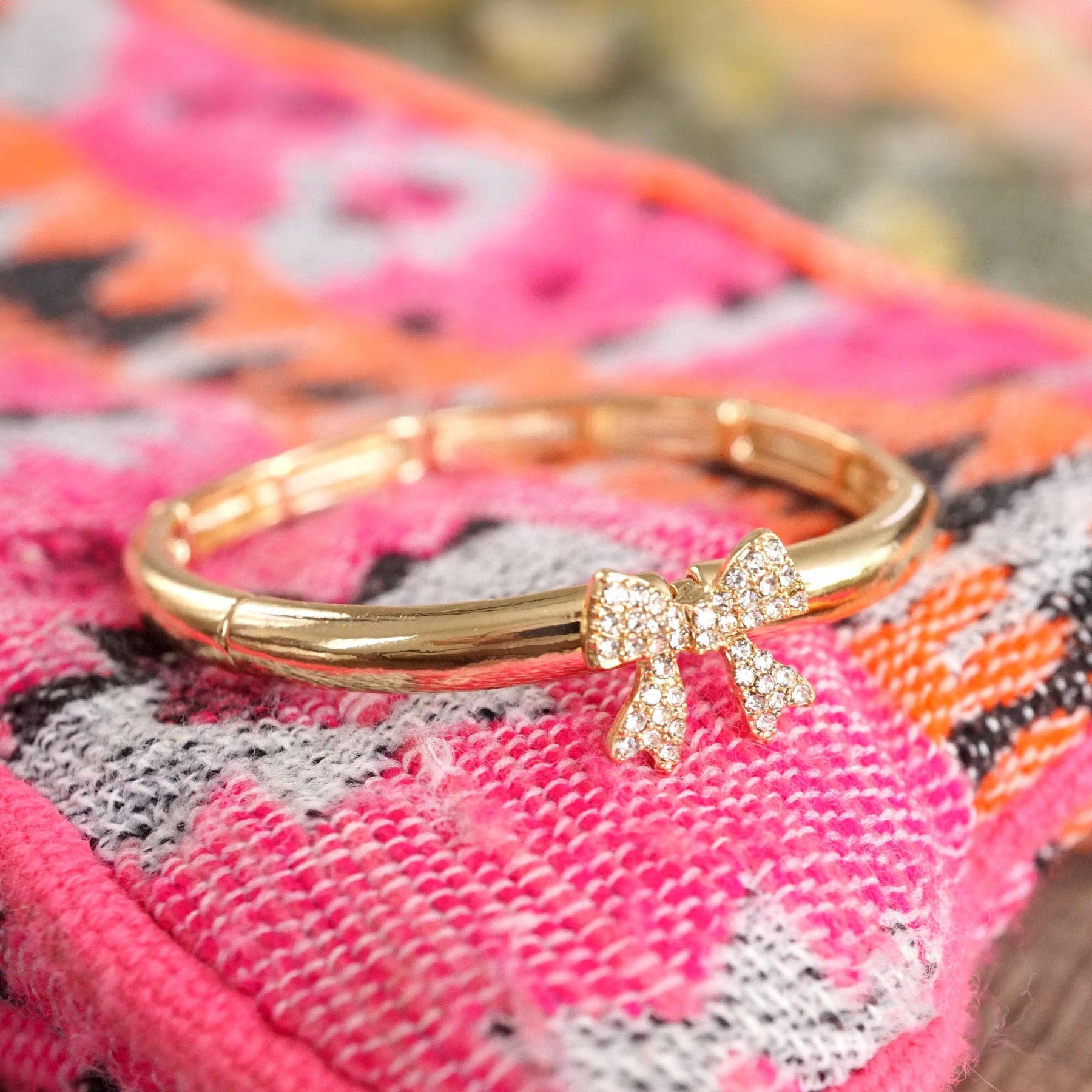 This crystal bow bangle brings playful sparkle and flexible styling to every jewelry box—ready to shine day or night.