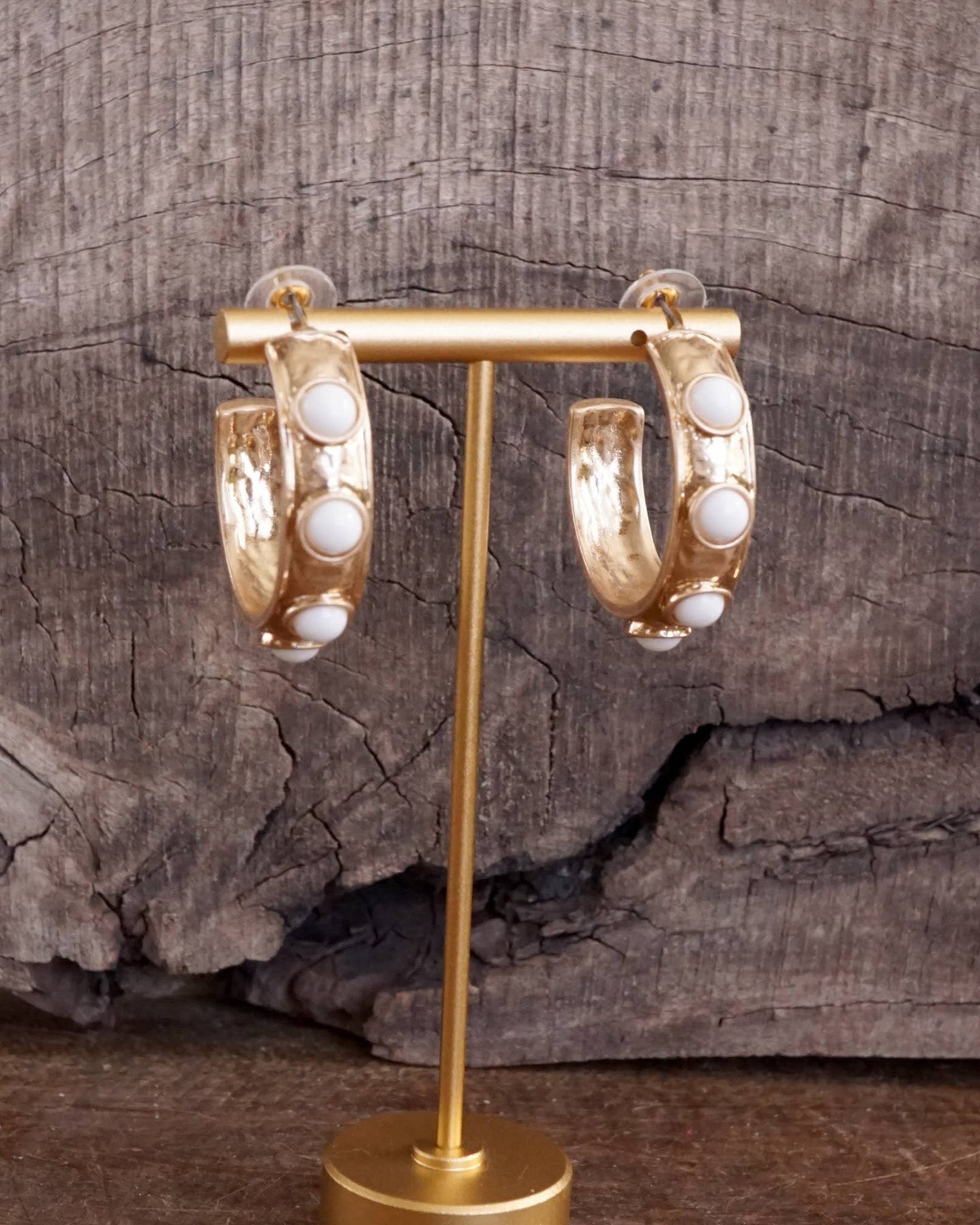 These softly glamorous hoops blend bohemian charm with a vintage nod. Finished in a warm gold tone and set with ivory acrylic cabochons, they add understated elegance and a touch of texture to your daily style.