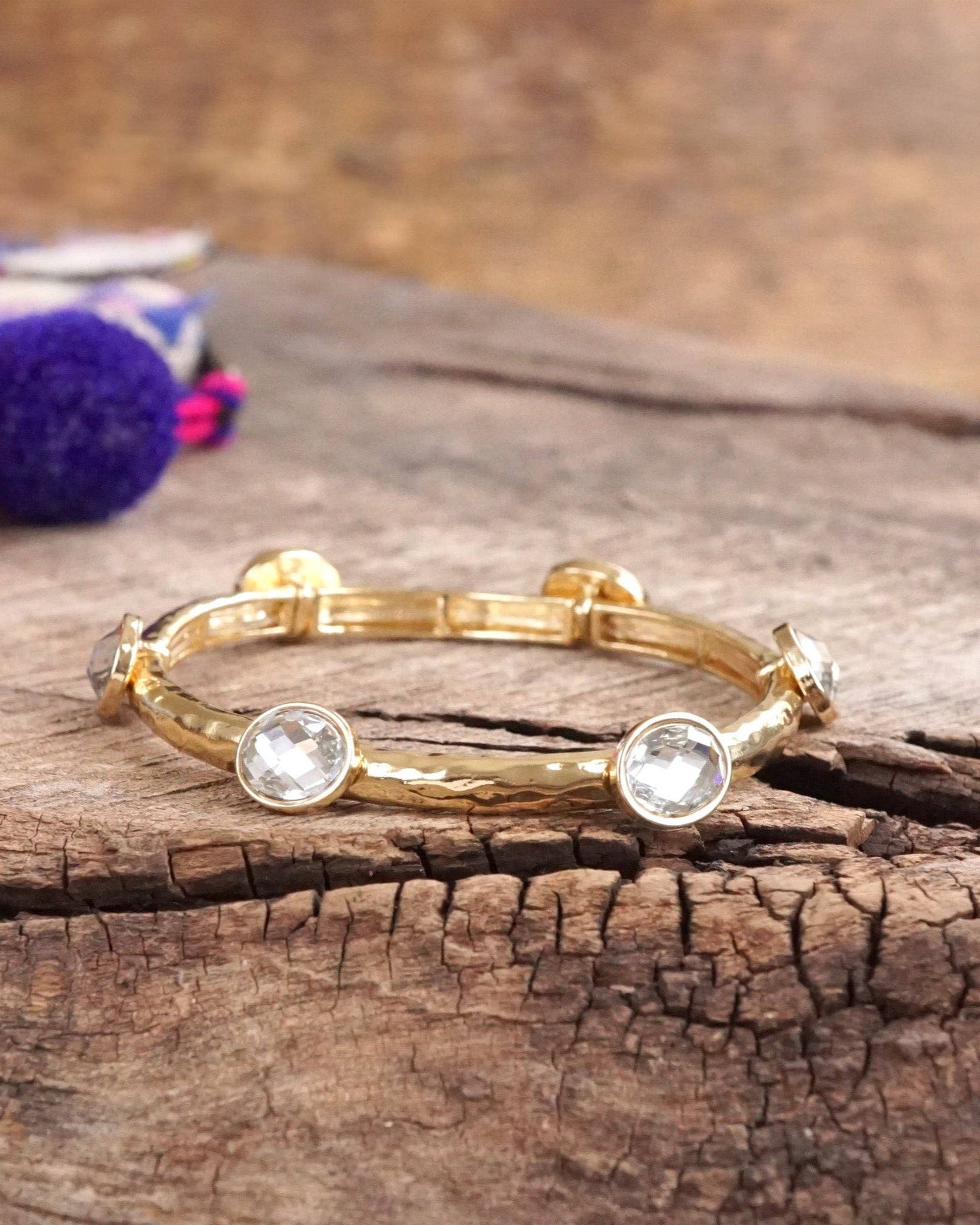 Classic and versatile, this bangle brings a hint of shine to any outfit. It features sparkling clear faceted stones on a hammered gold-tone stretch band, blending elegance with ease.