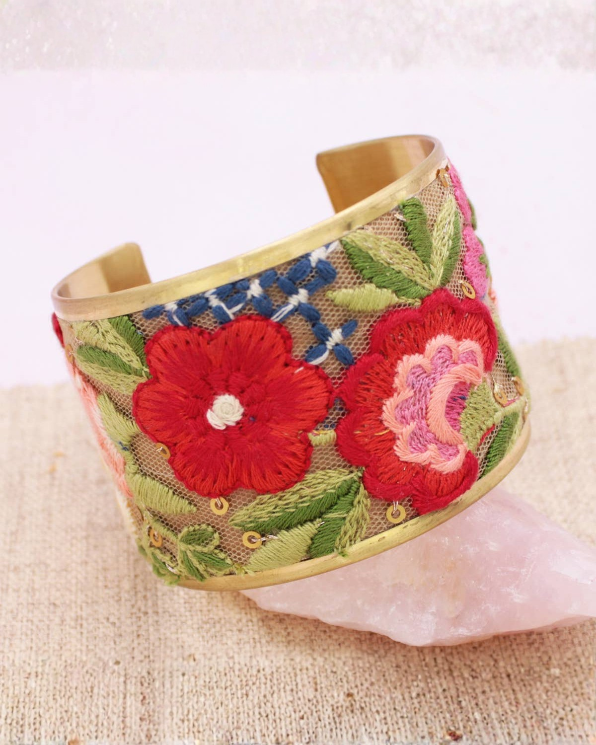 Bold, vibrant, and rich with vintage character, this floral embroidered cuff bracelet is a true statement piece. Hand-embroidered mesh fabric showcases red, blue, pink, and yellow floral details accented with subtle gold sequins, all framed by a gleaming gold cuff. It’s the kind of piece that instantly adds artistry and personality to floral, vintage-inspired, or boho looks.