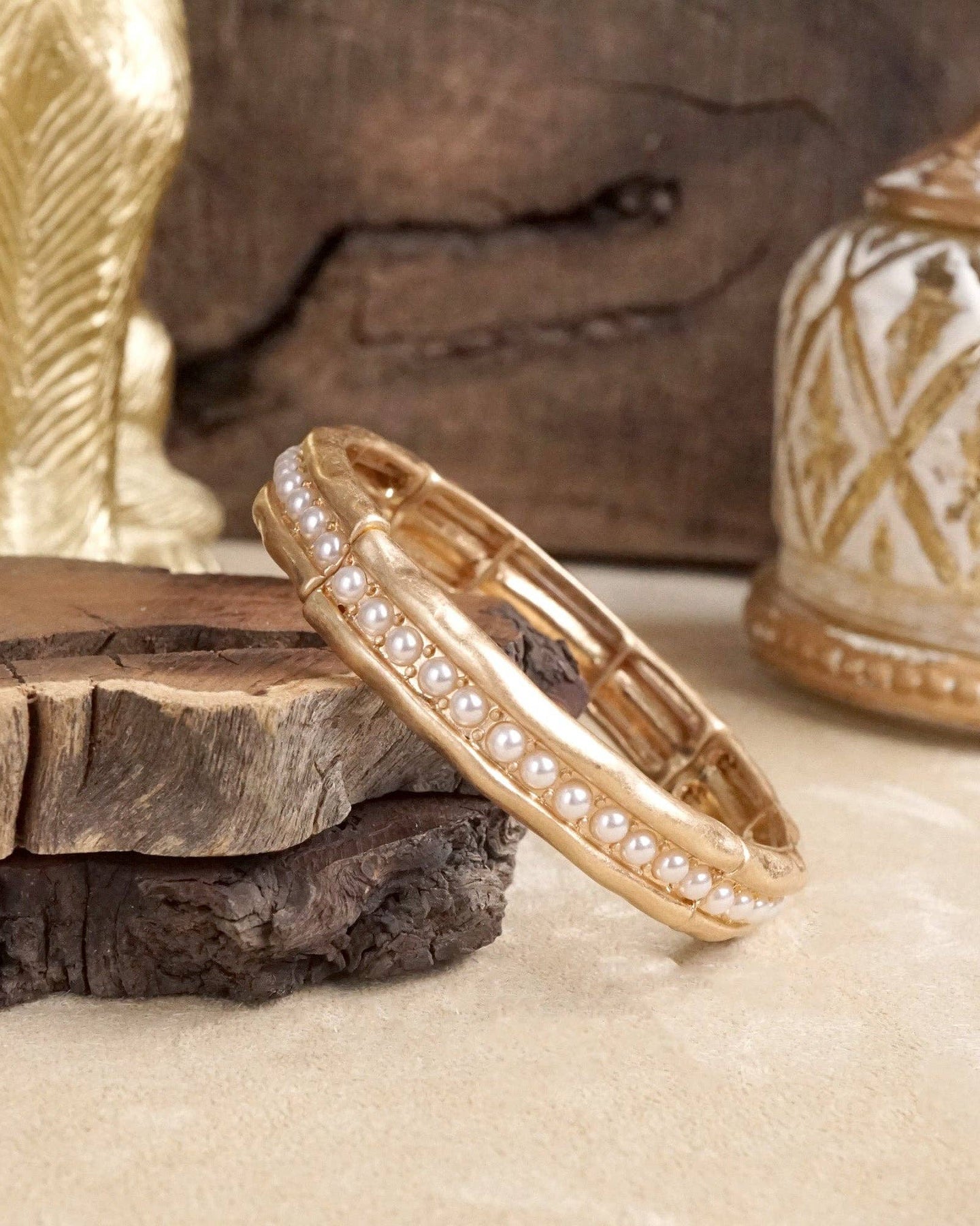 Delicate and versatile, this brushed gold-tone stretchy bangle adds quiet elegance with its slim 0.3" width and subtle crystal or pearl accents. Wear it solo or stack it with other favorites for a refined layered look.