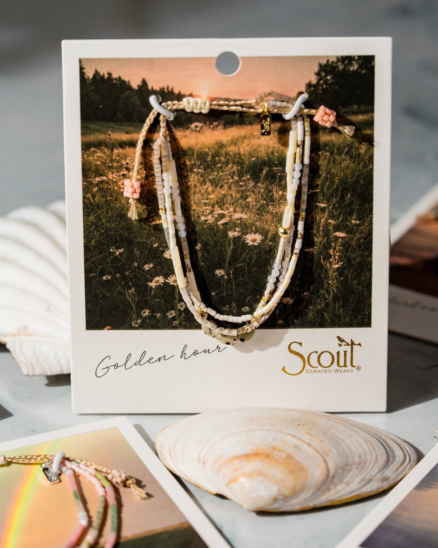 The semi-precious stone and its meaning are highlighted on the back of each card and connect to the photograph on the front of the card. Each playful stacking bracelet incorporates semi-precious stones along with Japanese glass Miyuki beads.