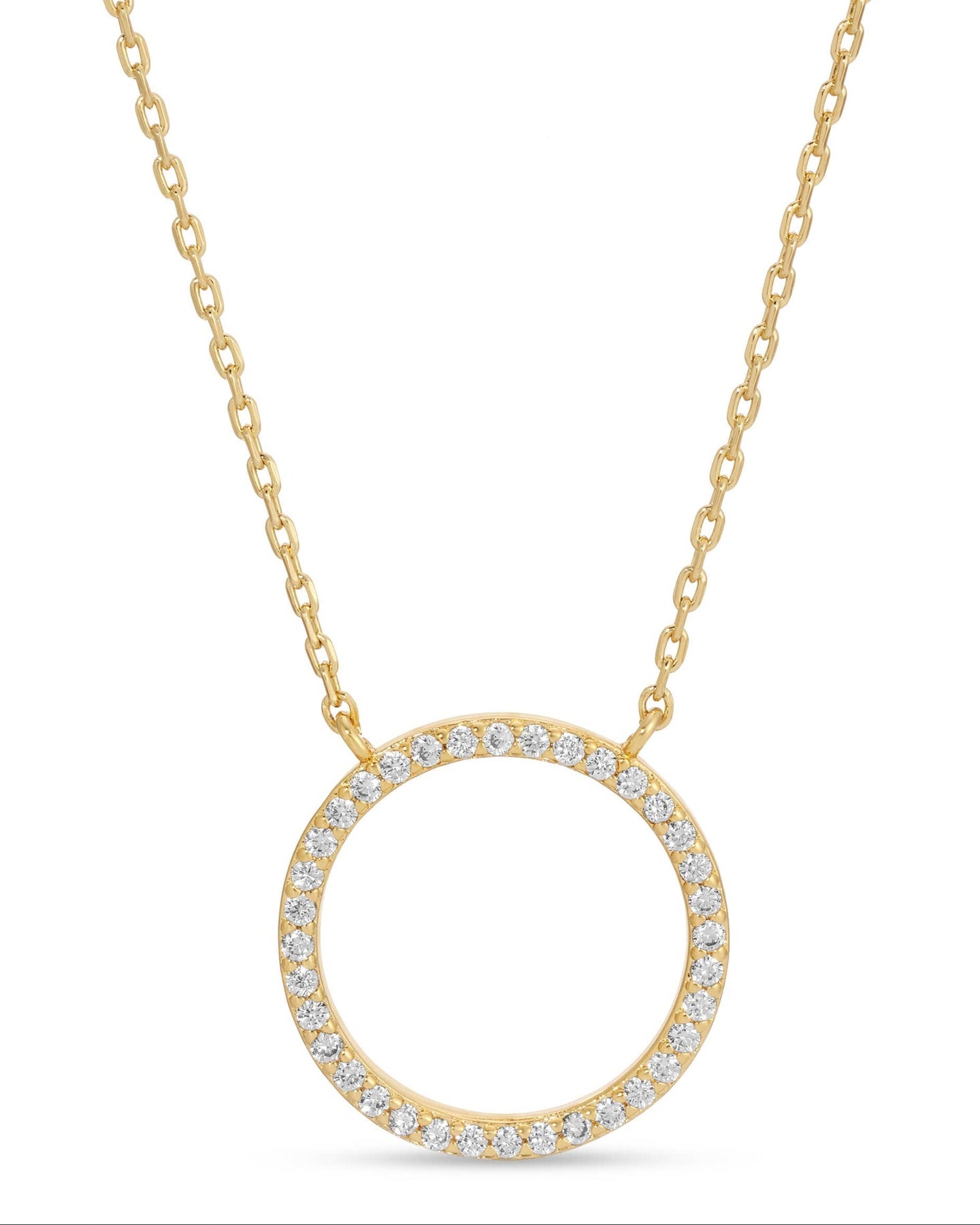 Delicate with just the right amount of sparkle, this open pavé circle pendant is an effortless way to add polish to your everyday look. The slim circular silhouette is accented with shimmering cubic zirconia, catching the light beautifully without feeling overdone. Worn solo or layered with your favorite chains, it brings a refined glow that works from daytime errands to evening plans.
