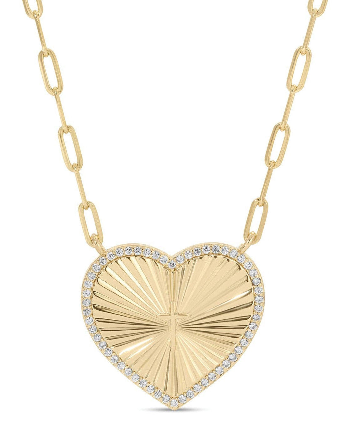 Meaningful with a modern edge, this pavé heart burst necklace blends symbolism and sparkle in the most wearable way. The heart-shaped pendant features a shimmering pavé border with a delicate cross at the center, all suspended from a sleek paperclip chain that keeps the look current and refined. It’s a beautiful balance of sentiment and style—easy enough for everyday wear, yet special enough to stand on its own.