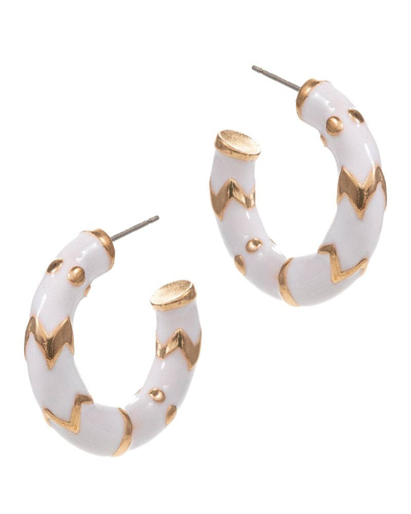 Fresh and clean with a whimsical twist, these white enamel hoop earrings showcase a subtle chevron pattern for added texture and charm. Their easy size and lightweight feel make them ideal for everyday wear.