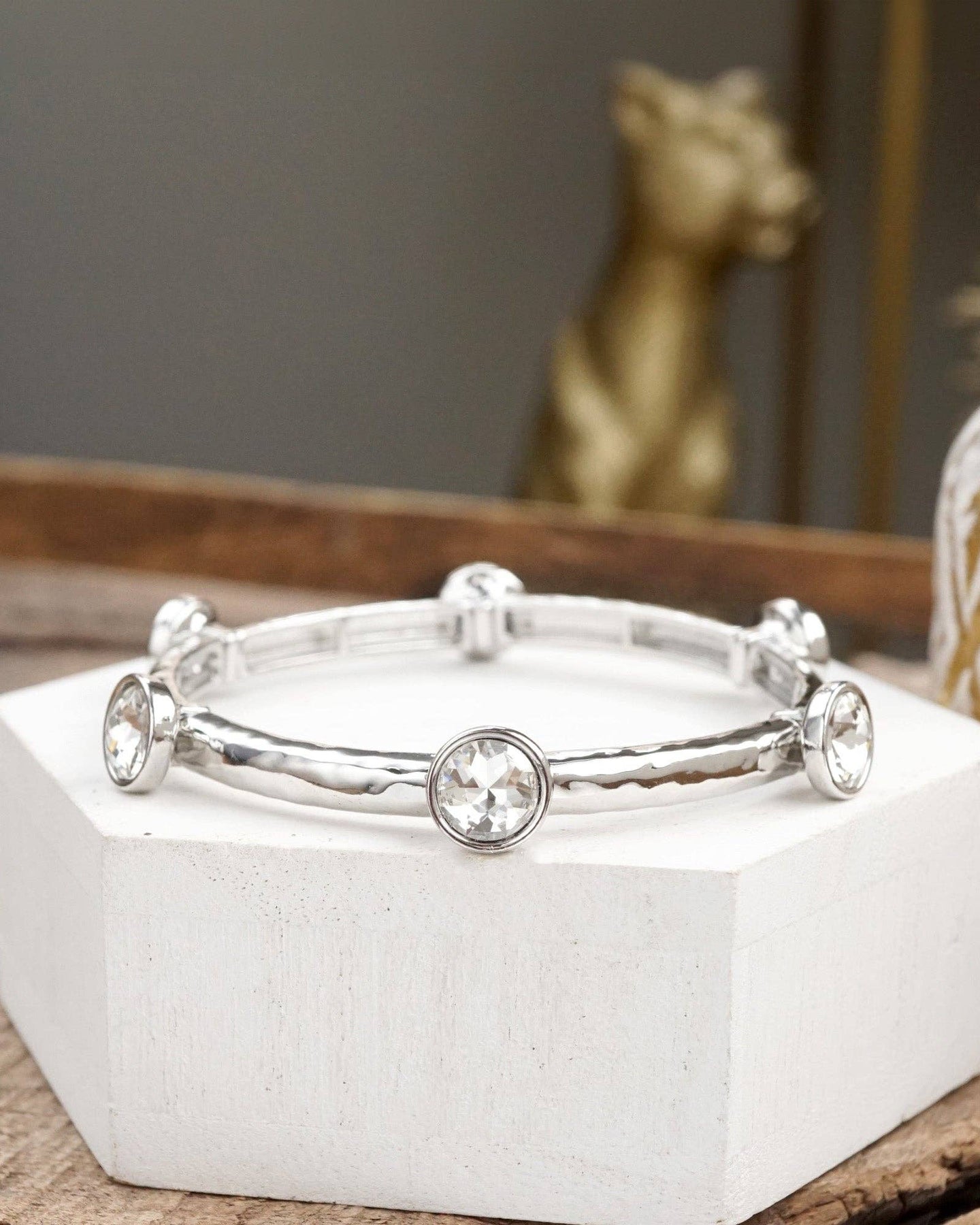 Bright, brilliant, and made to catch the light—this stretchy silver-tone bangle dazzles with 0.4" clear crystals and an organic textured finish. Whether worn solo or stacked, it adds instant sparkle and shimmer to your everyday style.