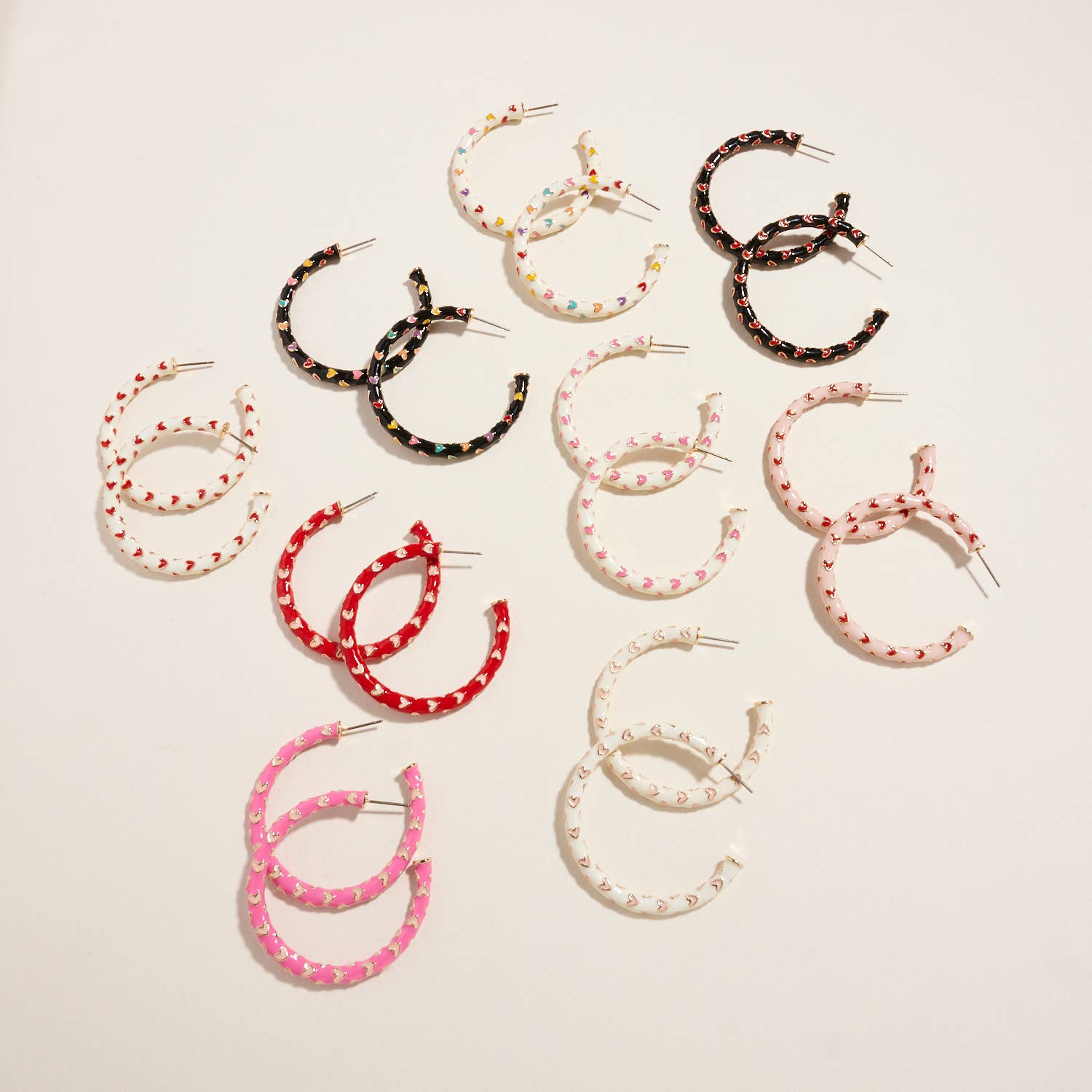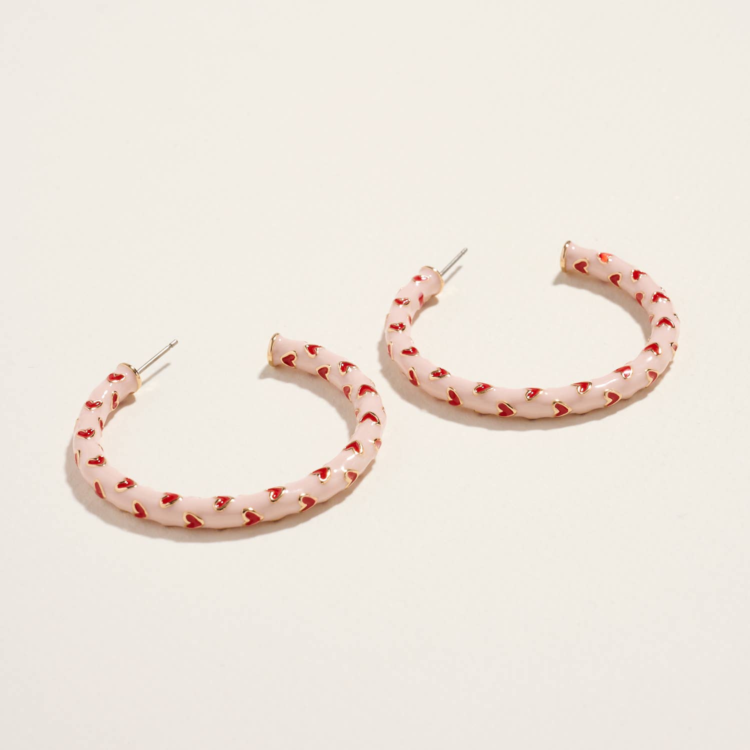 Sweet with a bold twist, these enamel hoop earrings feature a playful heart pattern in classic pink and red tones. The glossy finish and perfectly sized hoop make them easy to wear while still adding a romantic pop to everyday outfits.