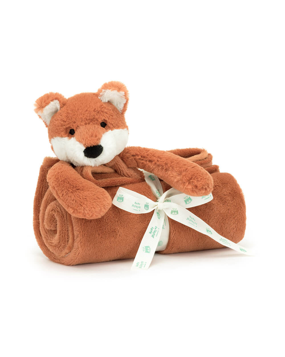 Introducing the delightfully soft and snuggly Bashful Fox Cub Blankie. Combining our most loved Bashful Fox Cub's adorably perky orange ears and squashy paws, and oval squishy nose with a blankie made from the same irresistibly soft fur made of recycled fibers. Neatly rolled and tied with a Baby Jellycat grosgrain ribbon, this is an endearing gift full of comfort and companionship.