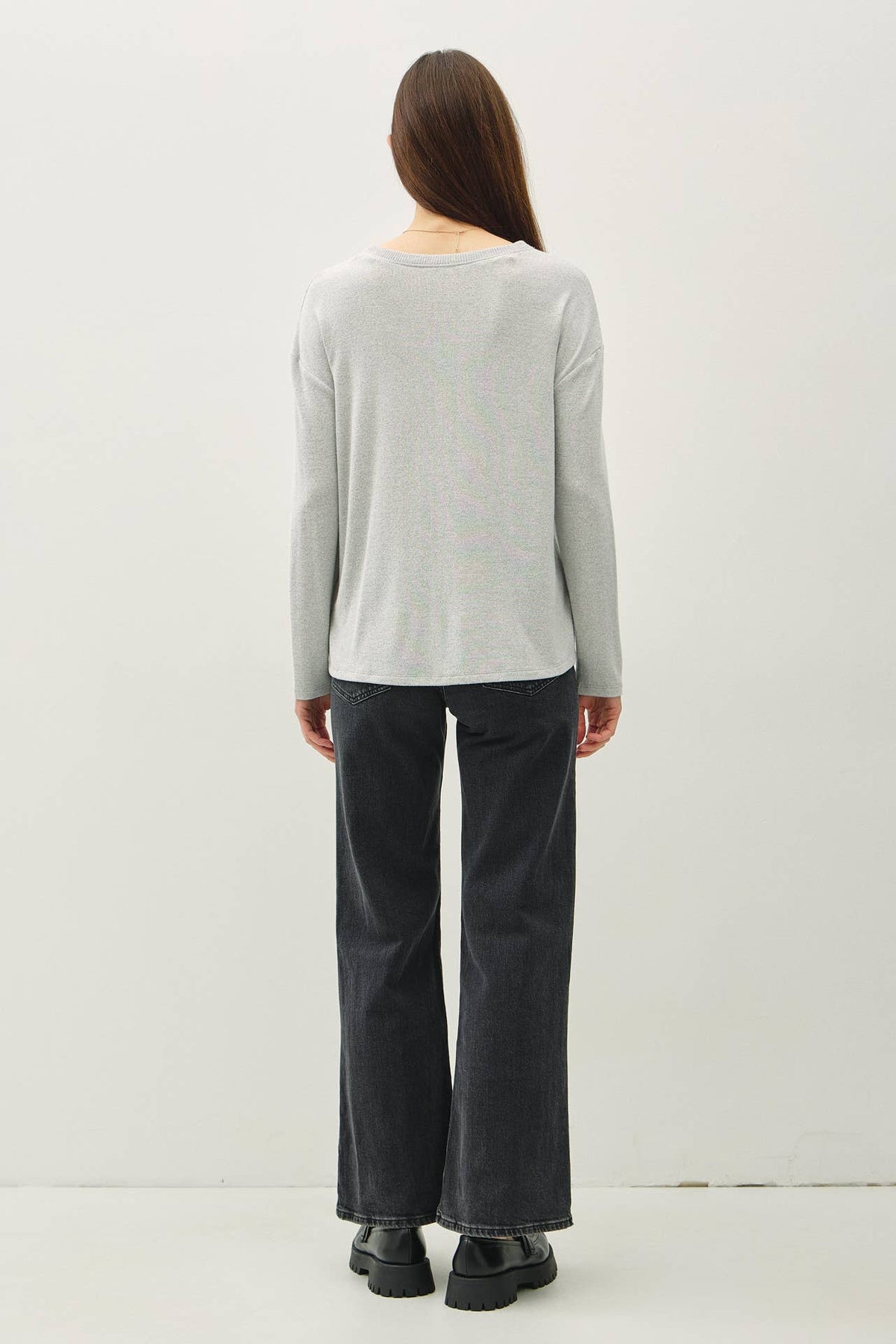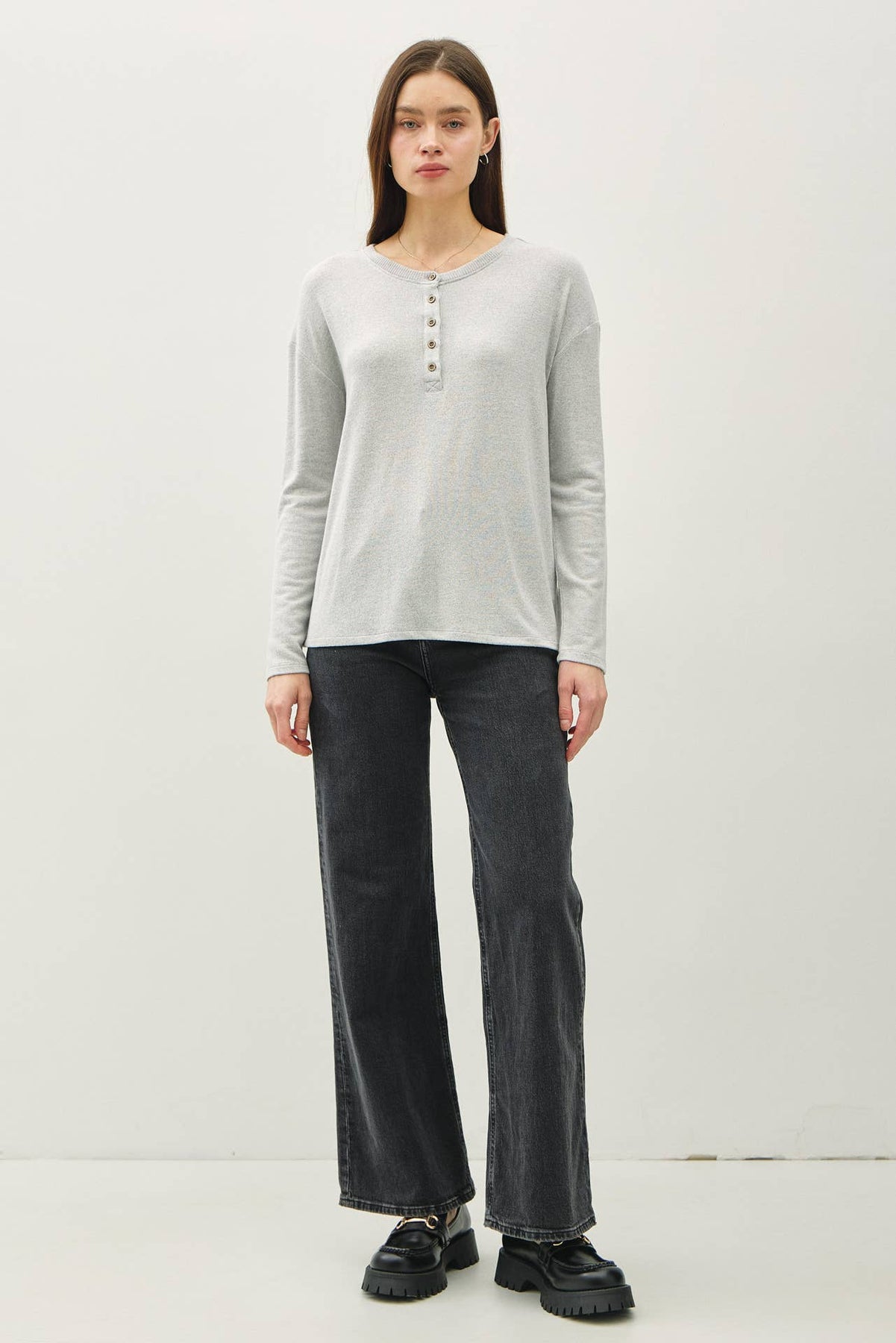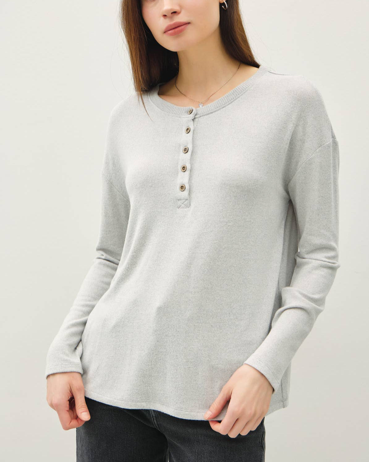 Soft, slouchy, and seriously versatile. This heathered grey henley is the kind of top you’ll want to live in—crafted in a stretchy hacci knit with a cozy, laid-back shape and subtle side slits for added movement.