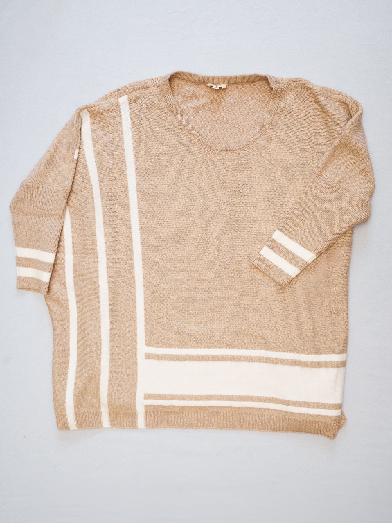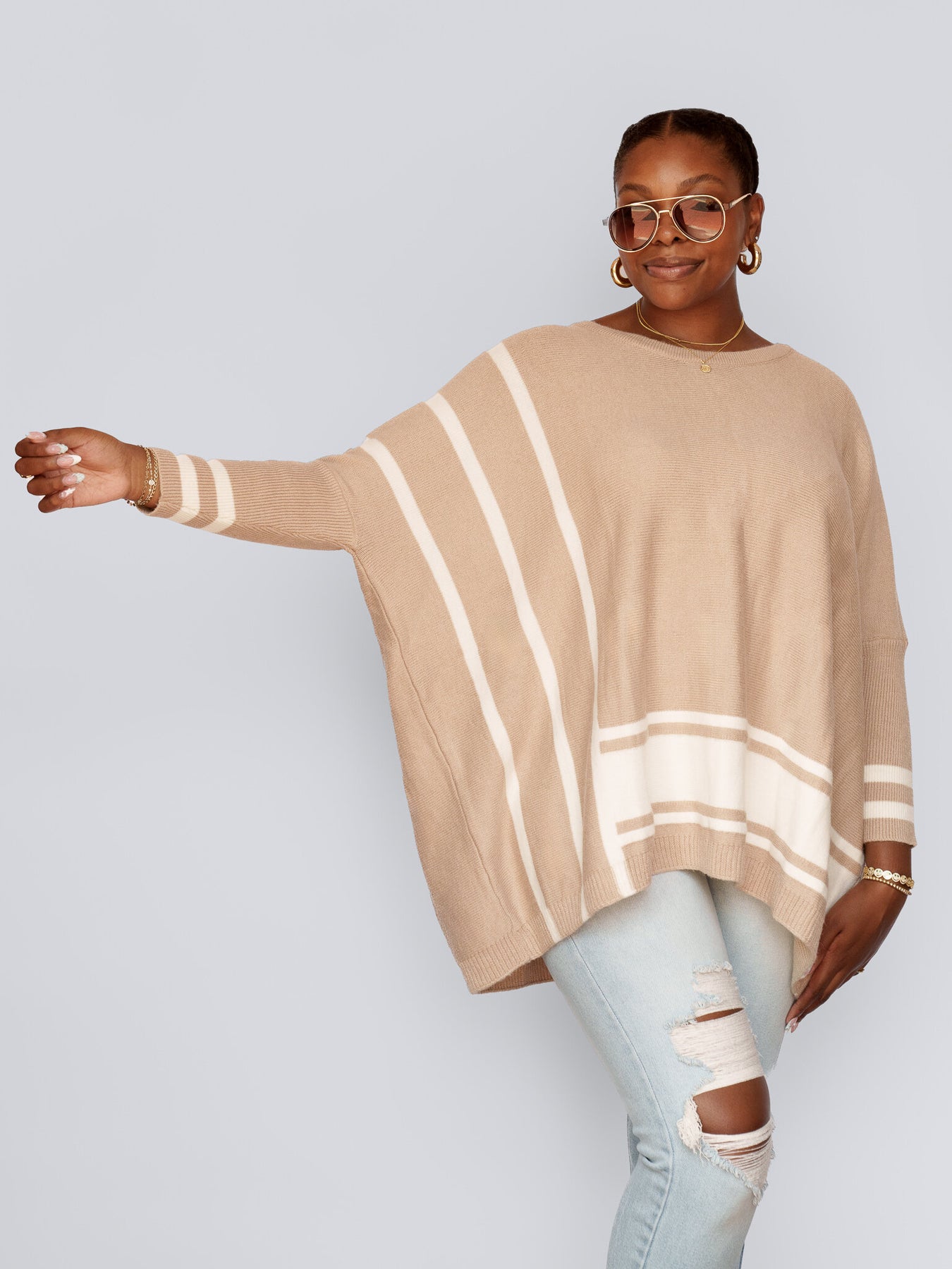 Elevate your casual wardrobe with our Lydia Striped Batwing Sweater in oatmeal. This unique sweater features a relaxed, batwing silhouette that effortlessly combines comfort and style. The bold stripes add a tasteful touch, while the long cuffs provide a chic detail that sets this sweater apart.