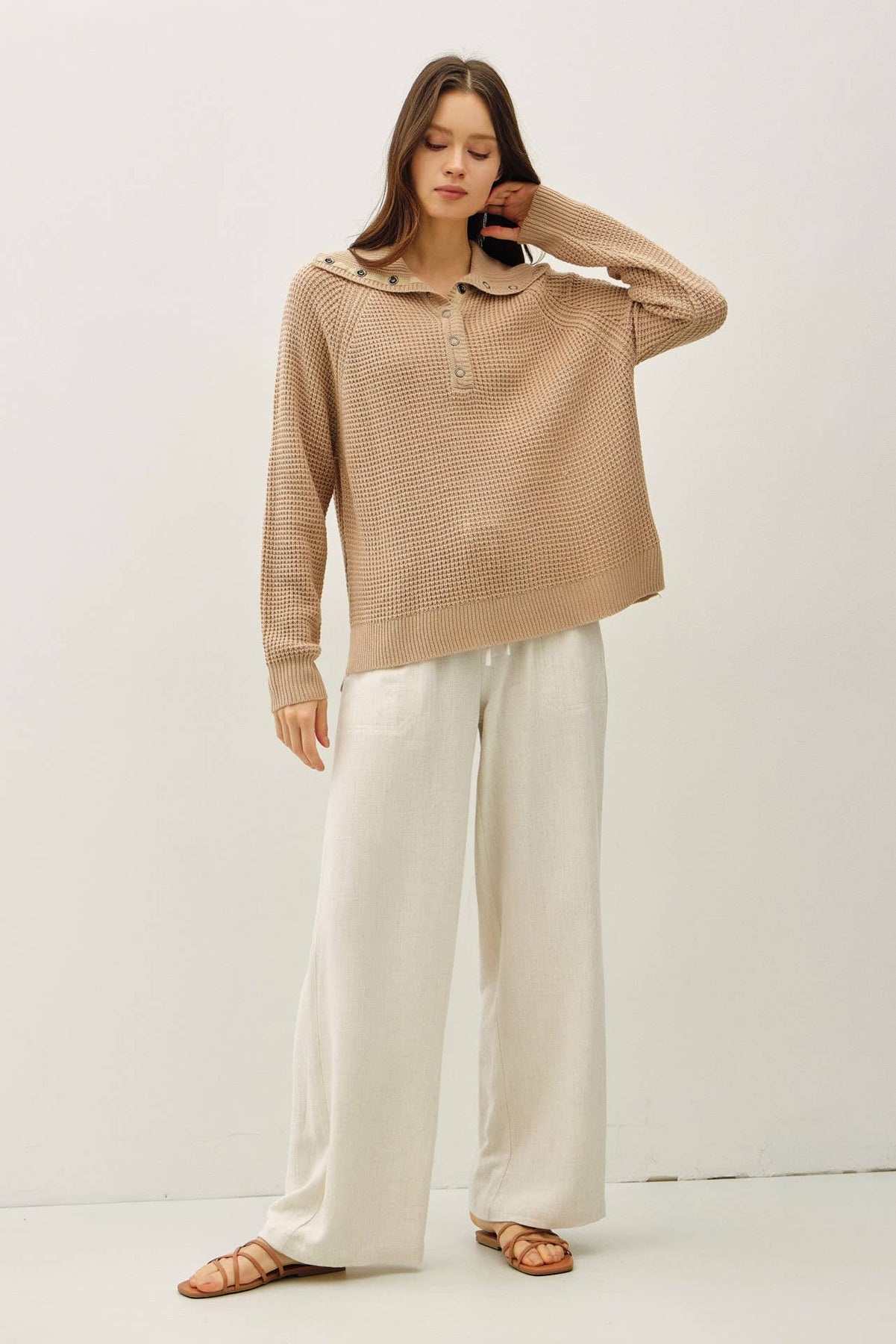 Sweetly structured with a touch of prep, this waffle knit pullover brings charm to cooler days. The Peter Pan collar and snap-front detail make it stand out from the everyday, while the soft texture and relaxed fit keep things cozy. Ideal for coffee dates, lounging, or layering under a jacket when the weather shifts.