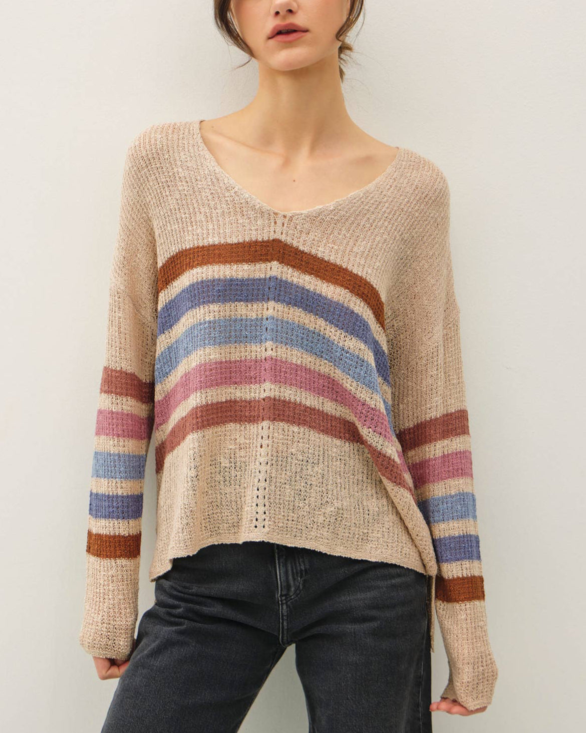Brighten chilly days with this playful rainbow stripe sweater in a soft vanilla hue. Its dolman sleeves and cozy knit make it a cheerful yet easygoing option for fall layering.