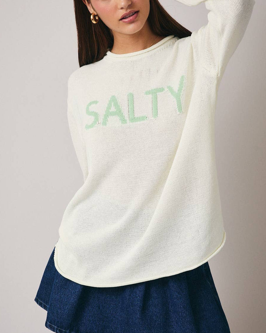 Easygoing with a hint of attitude, the “SALTY” Lightweight Sweater brings playful personality to a relaxed coastal silhouette. Featuring the same breathable knit and comfortable fit as the “BEACH” version, this long sleeve sweater is perfect for layering on breezy days when you want comfort with a little edge.