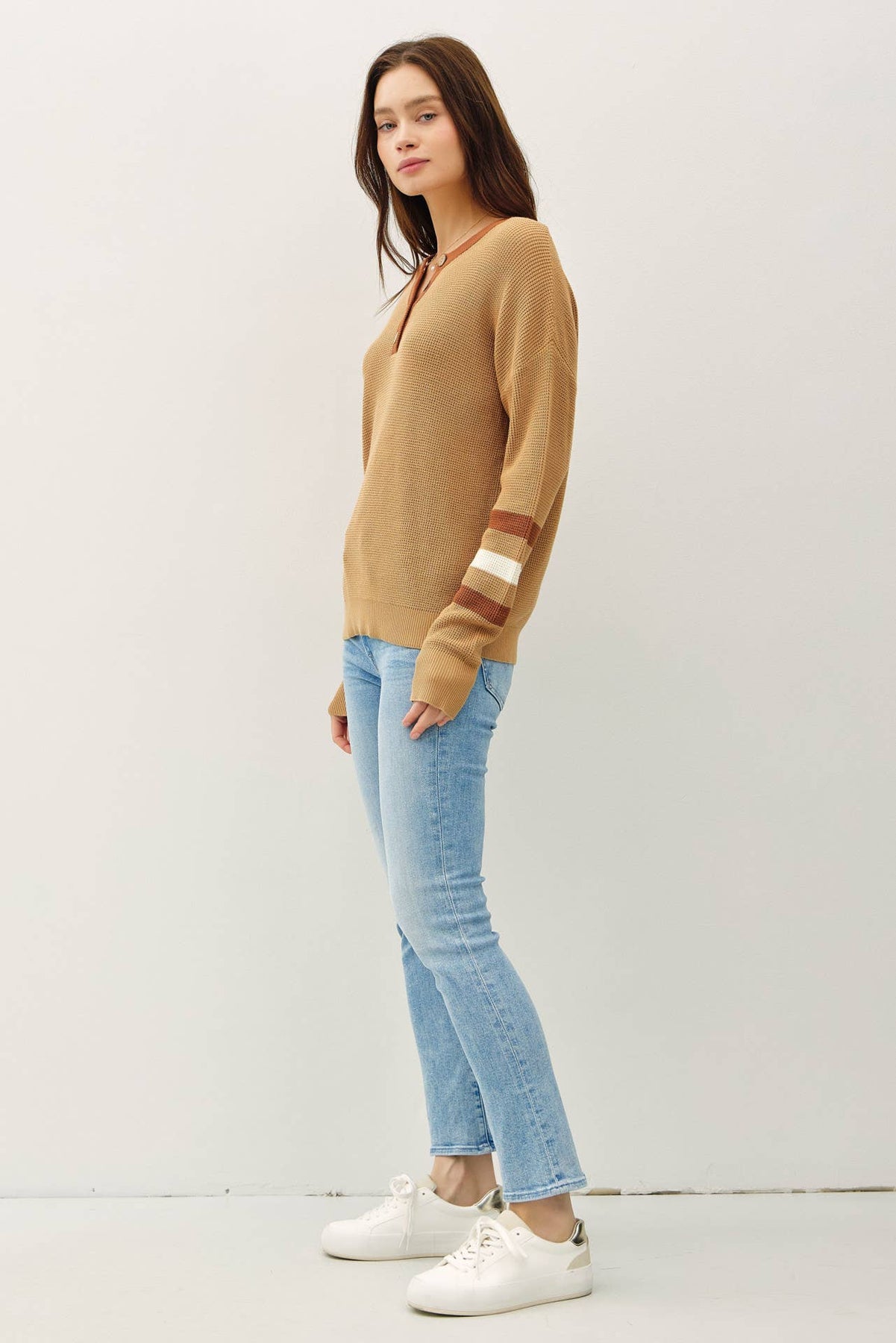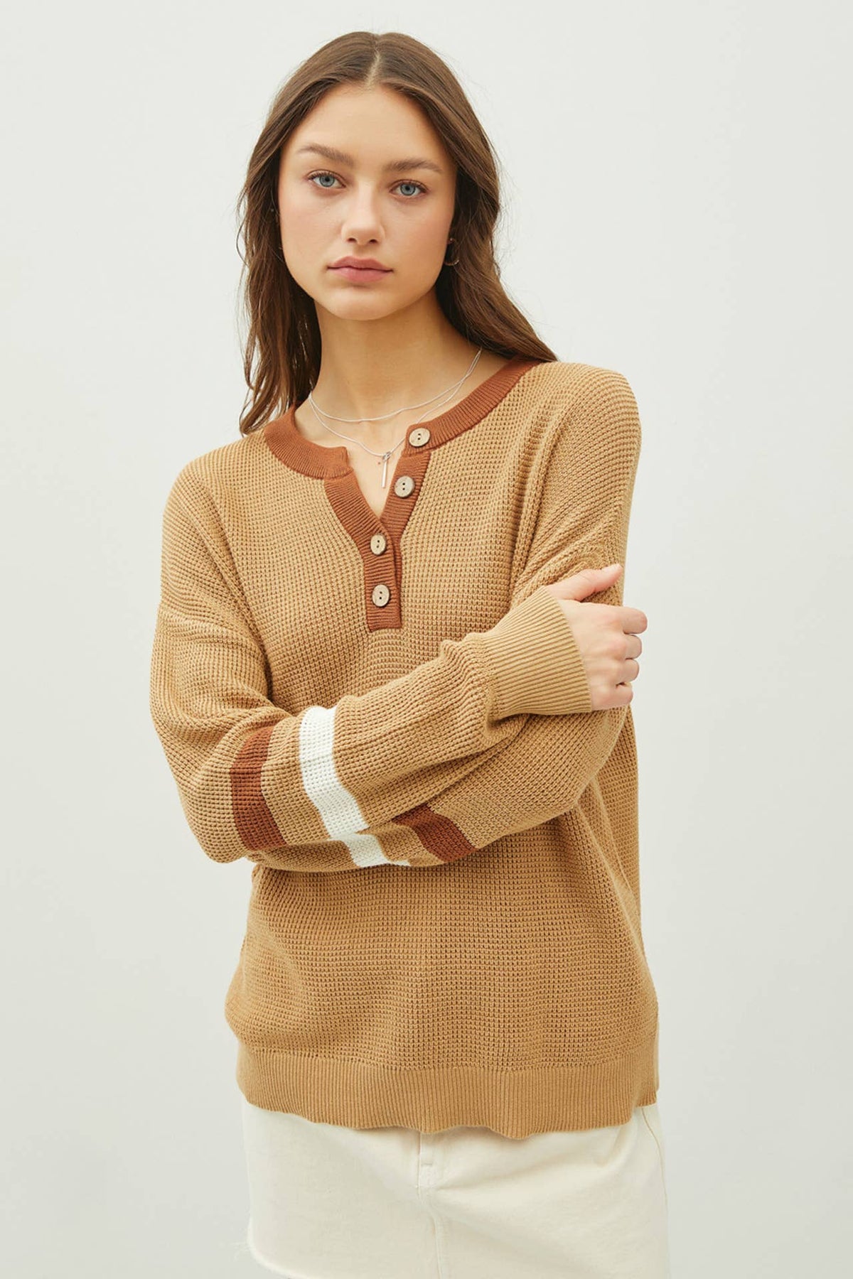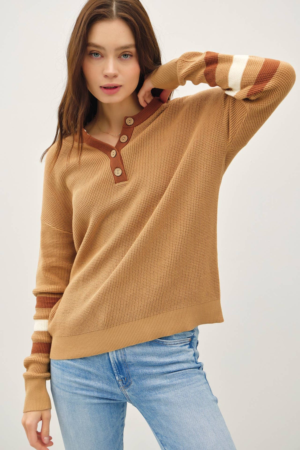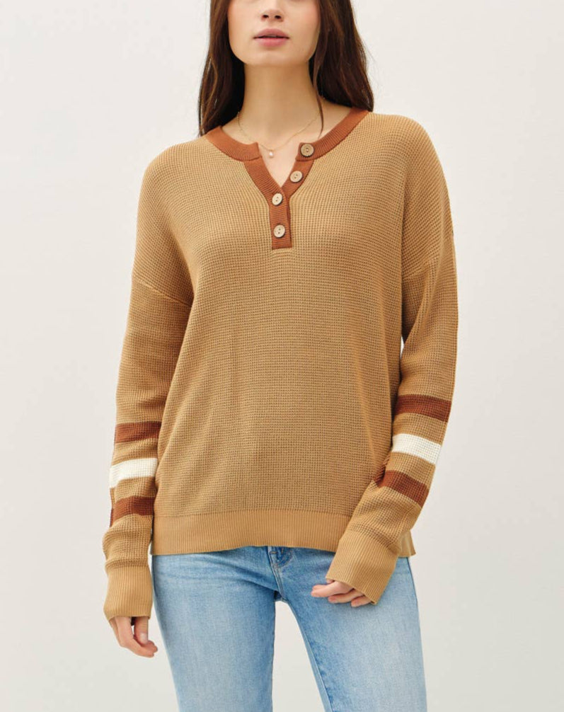 With its cozy waffle knit texture and sporty sleeve stripes, this multi-toned henley is your new go-to for laid-back days. The relaxed, boxy fit pairs effortlessly with jeans or leggings, while wooden buttons and a V-notch neckline give it that extra charm.