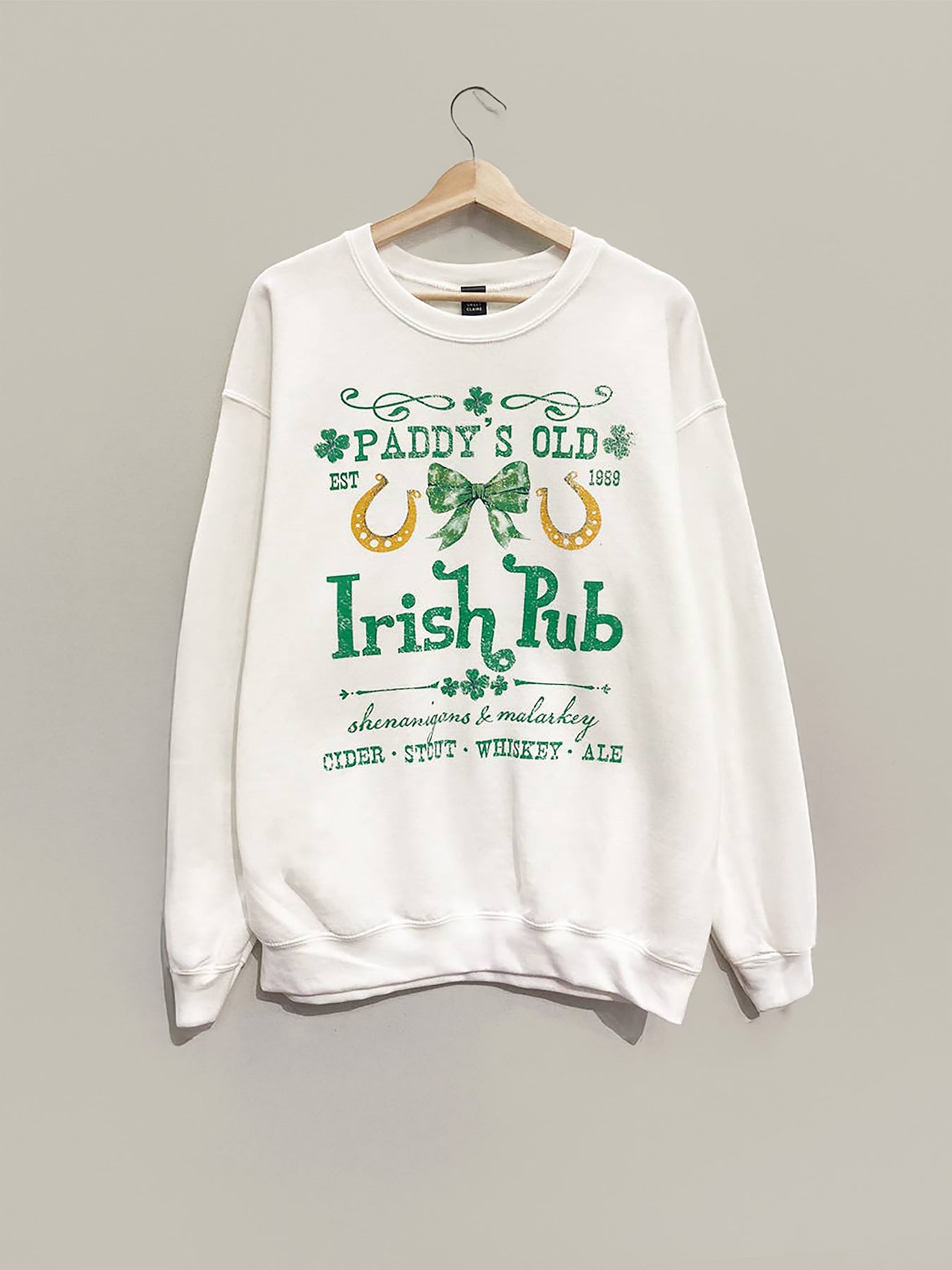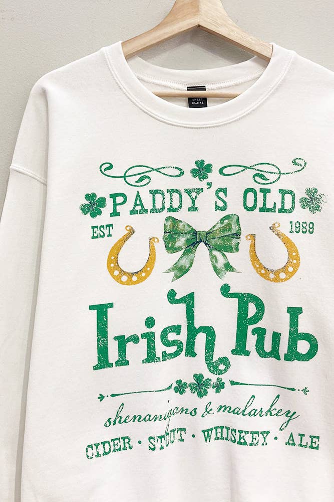 Celebrate St. Patrick’s Day in cozy style with this vintage-inspired Paddy’s Old Irish Pub sweatshirt. Designed for comfort and festive flair, this oversized crew-neck pullover features a distressed-style Irish pub graphic, complete with shamrocks, golden horseshoes, and a charming green bow. Whether you're sipping on stout, whiskey, cider, or ale, this sweatshirt brings shenanigans and malarkey to any occasion. Perfect for casual wear, pub nights, or layering up for chilly days.