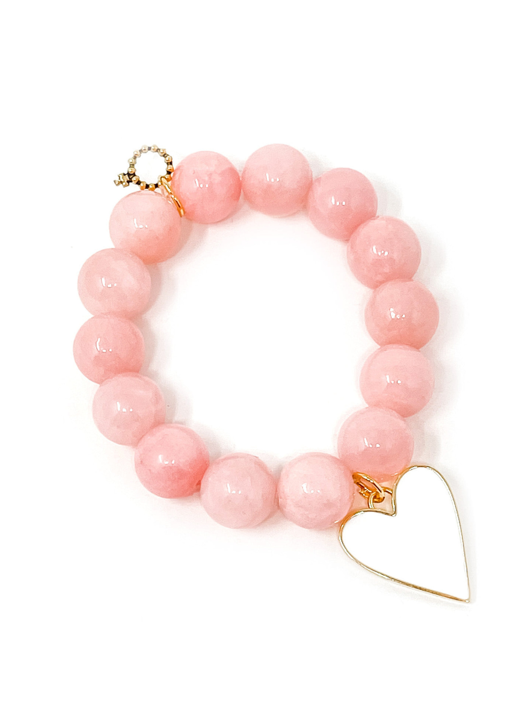 Softly romantic with a meaningful touch, this Powerbeads by Jen bracelet features smooth petal pink jade gemstones paired with a glossy white enameled gold heart charm. Jade is known for promoting health, prosperity, and long life, making this bracelet as thoughtful as it is beautiful. The gentle blush tones feel light and feminine, while the heart charm adds a polished, sentimental finish that elevates everyday wear.