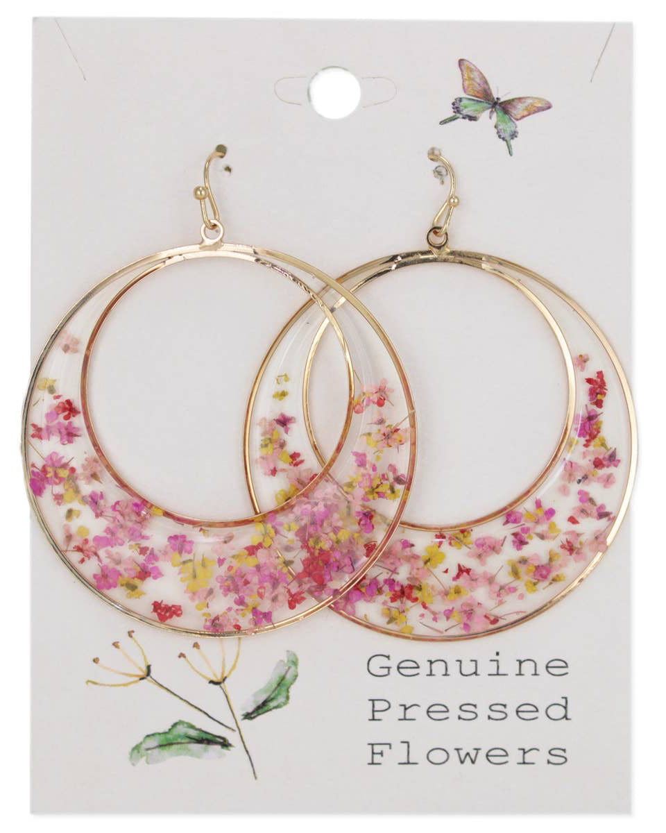 Bold and floral with a romantic twist, these large round crescent earrings bloom with real pink and white dried flowers. Framed in gold and set in clear acrylic, they’re the ultimate statement for sunny days and spring styling.
