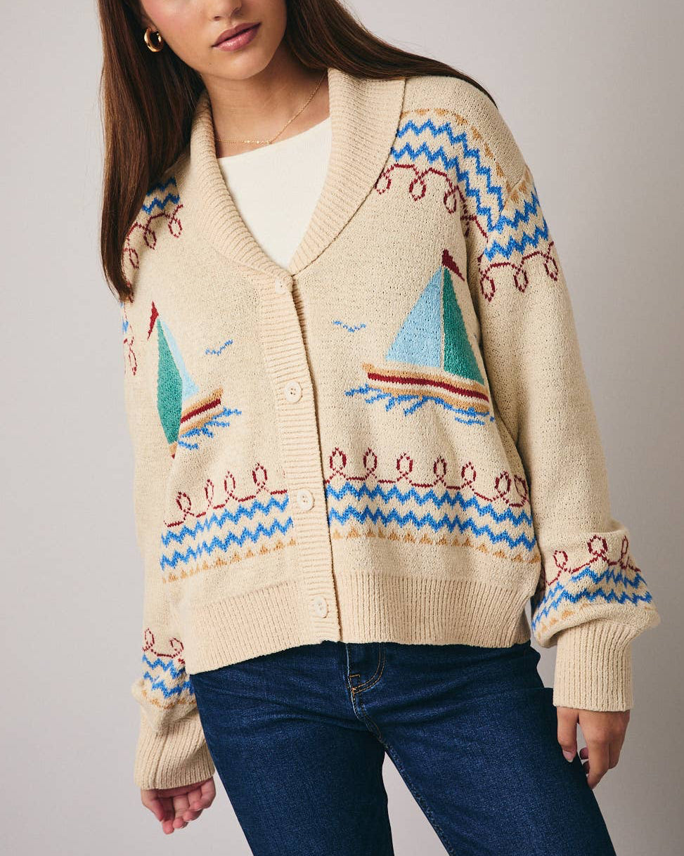 Playful yet polished, the Portside Yacht Cardigan is a cozy statement layer designed for effortless styling. This oversized, heavyweight knit features charming sailboat details woven throughout, giving it a relaxed coastal feel with timeless appeal. A classic button-up front and soft v-neckline make it easy to wear open or closed, while the roomy silhouette adds comfort without sacrificing style. Perfect for layering on cooler days, this cardigan is ready for everything from casual outings to breezy evenings by the water.