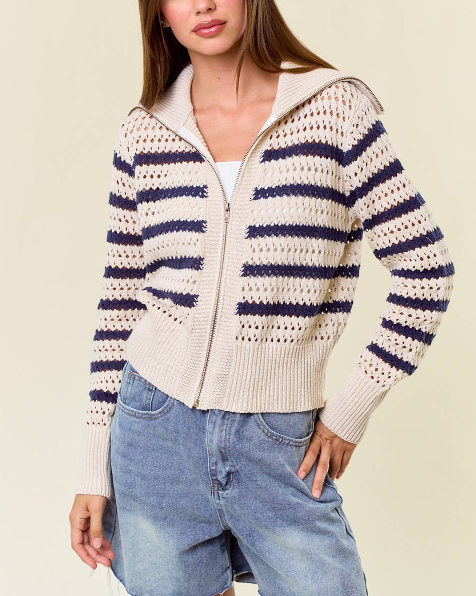 Meet Colette, the sweater jacket that gives chic coastal vibes a cozy upgrade. With her breathable pointelle knit and timeless stripes, she’s the perfect layering piece for breezy mornings and cool evenings alike.