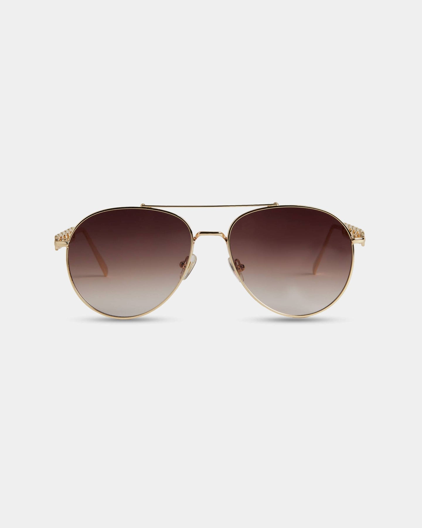 Classic meets modern with these Embellished Aviator Sunglasses. Designed with sleek gold metal frames and a timeless aviator silhouette, these sunglasses offer an effortlessly cool and sophisticated look. The gradient brown lenses provide full 100% UVA/UVB protection, while the intricate embellishment on the temples adds a unique, eye-catching touch. Whether you're running errands, hitting the beach, or traveling in style, these sunnies are your perfect companion for any occasion.