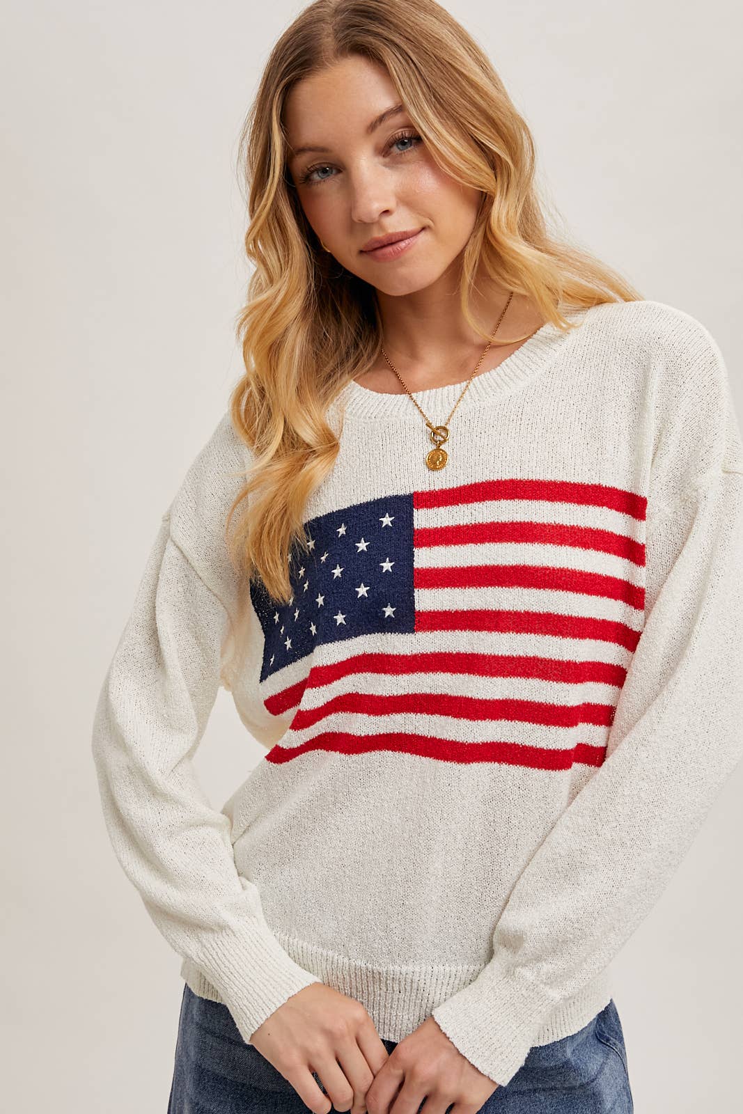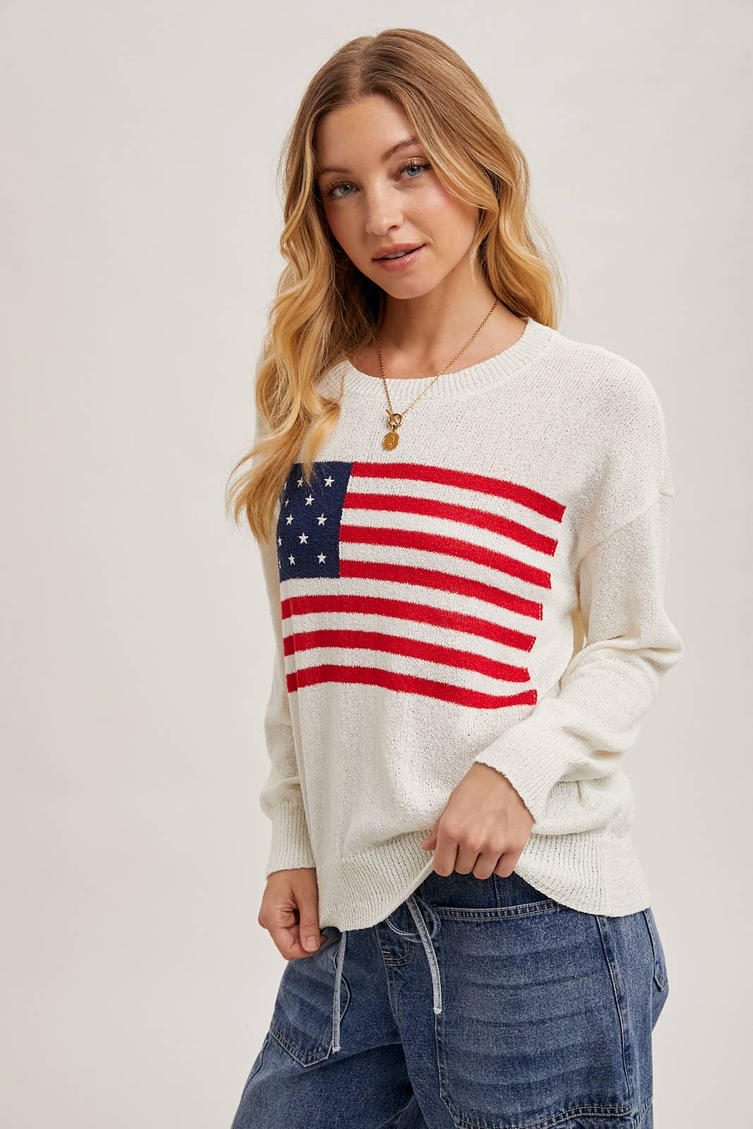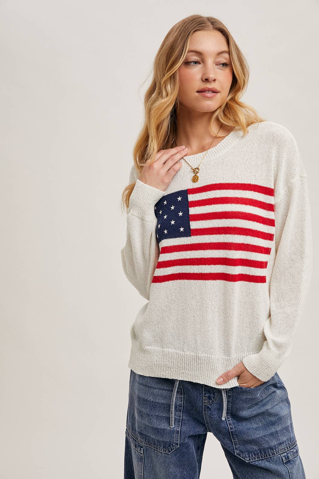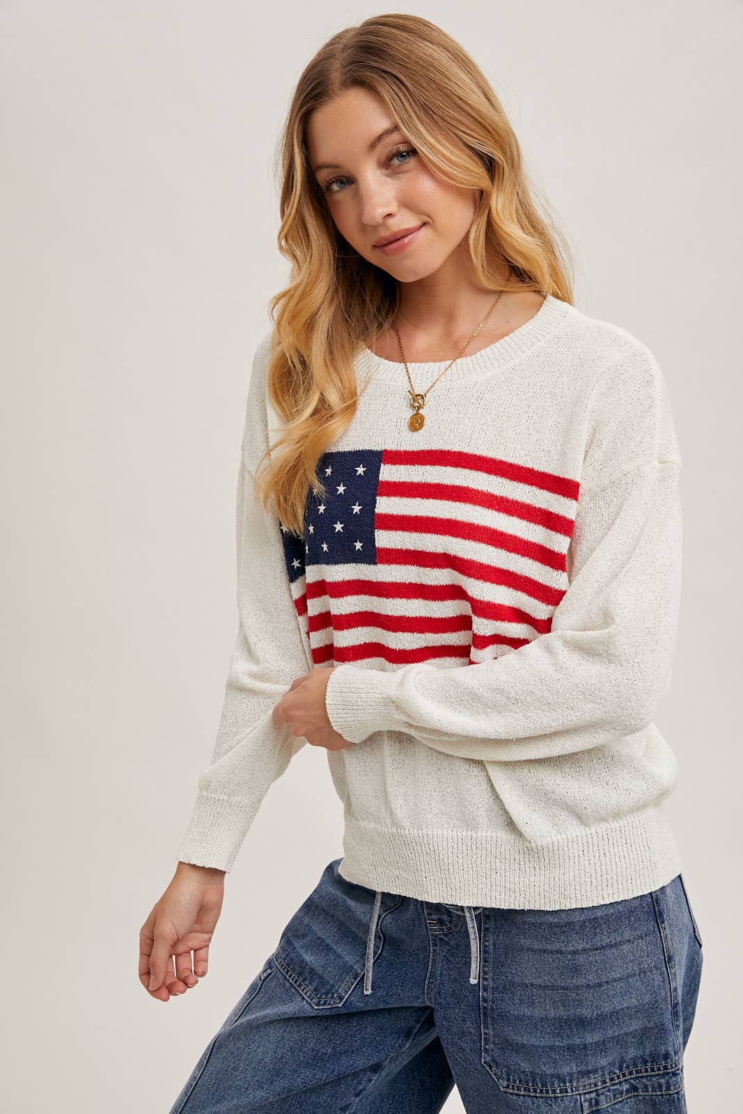 Show your patriotic spirit in style with this cozy American Flag Sweater Pullover. Featuring a bold flag design on a soft ivory knit, this piece pairs comfort with statement-making charm. The classic crew neck and ribbed trim provide a timeless fit that’s perfect for Fourth of July gatherings or year-round Americana vibes.